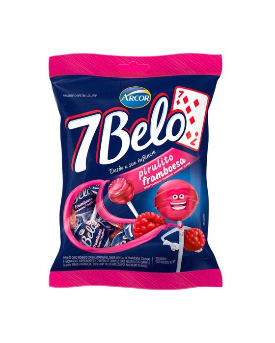 Caracteristicas:Na ponta desse palitinho tem o sabor que já conhece e nunca esquece. A diversão é garantida com o Pirulito 7 Belo Framboesa! - Sabor: Framboesa- Contém: 500gPirulito duro recheado de bala mastigável, sabor artifical de framboesa, colorido e aromatizado artificialmente.Ingredientes: açúcar, xarope de glicose, gordura vegetal, acidulantes: ácido cítrico e ácido láctico, umectante lactato de sódio, aromatizante, emulsificantes: lecitina de soja e mono e diglicerídeos de ácidos graxos, corantes artificiais: vermelho 40 (E129/INS 129) e indigotina (E132/INS 132).NÃO CONTÉM GLÚTEN.ALÉRGICOS: Contém derivados de soja.* As especificações podem ser alteradas sem aviso prévio** Imagem meramente ilustrativa.