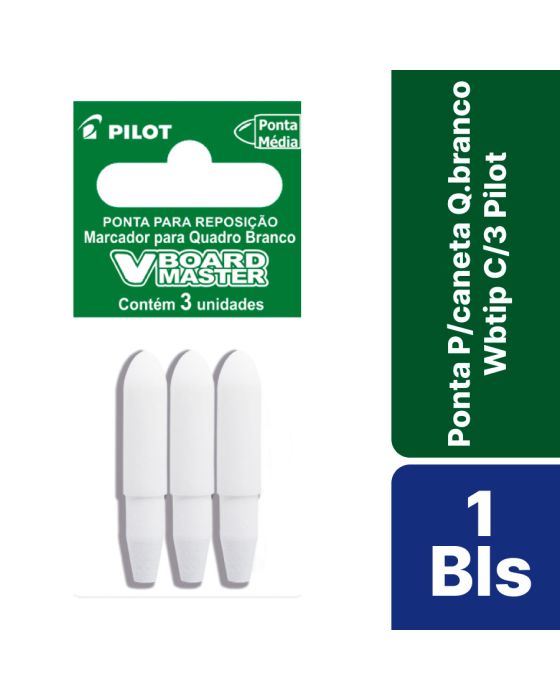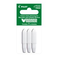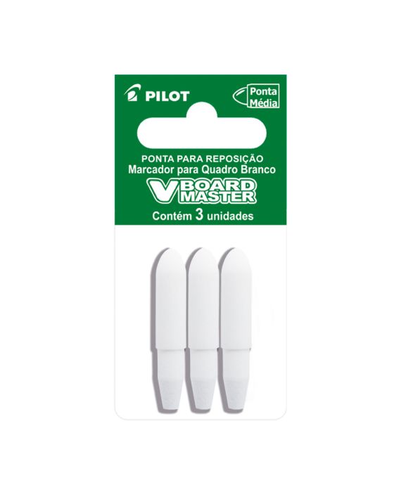 Características:Especialmente desenvolvida para ser utilizada no Marcador V-Board Master, esta ponta é fabricada em poliéster, garantindo que não danifique a superfície do quadro branco.A substituição da ponta é uma maneira eficaz de prolongar a vida útil do seu marcador, garantindo um desempenho consistente e duradouro. Mantenha a qualidade do seu marcador trocando a ponta do seu V-Board Master conforme necessário.Detalhes:- Marca: Pilot;- Modelo: Marcador V-Board Master;- Referência: 2450004;- Linha: Ponta para Marcador;- Tipo: Quadro Branco;- Cor: Branco;- Ponta: Poliéster 6,0mm (média);- Espessura: Espessura de escrita 2,3mm;- Contém: 1 blister com 3 unidades do produto;- Refil de ponteira para marcadores de quadro branco recarregável WBMA Pilot.Armazenagem:- Armazene o produto em local seco e arejado para garantir a integridade da tinta.Composição:- Poliéster.ATENÇÃO! MANTENHA FORA DO ALCANCE DAS CRIANÇAS E DOS ANIMAIS DOMÉSTICOS.* As especificações podem ser alteradas sem aviso prévio ** Imagem meramente ilustrativa.