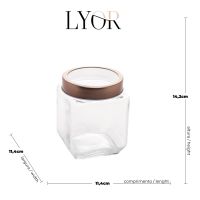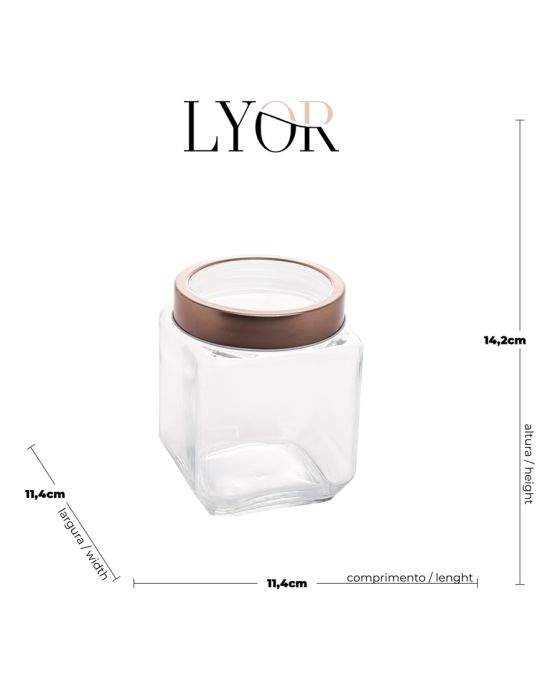 Características:O Pote de Vidro com Tampa de Metal e Acrílico Gastro Rosé de 1,2L da Lyor é uma escolha elegante e prática para o armazenamento de mantimentos em grande quantidade.Tampa de Metal e Acrílico Gastro Rosé:A tampa em metal com detalhes em acrílico Gastro Rosé oferece vedação hermética, mantendo os mantimentos frescos por mais tempo e adicionando um toque moderno e sofisticado ao conjunto.Design Elegante:O design elegante do pote confere um toque refinado à sua cozinha, tornando-o uma peça versátil para diferentes estilos de decoração.Versatilidade de Uso:Além de mantimentos secos, o pote pode ser utilizado para armazenar outros itens, como doces, biscoitos ou até mesmo objetos não alimentícios.Detalhes:- Marca: Lyor;- Modelo: Gastro;- Referência: 7524;- Linha: Porta Mantimentos;- Tipo: Armazenamento;- Cor da tampa: Rosé Gold;- Cor do corpo: Incolor;- Capacidade: 1,2 litros;- Contém: 1 unidade do produto;- Possui tampa com acrílico;- Design simples e elegante;- Produto Versátil, podendo ser usado armazenamento de diversos tipos de produtos;- Fácil de limpar.Ideal para:- Ideal para Cozinha, Copas, Lavanderias, Dispensas, lanchonetes, restaurantes, panificadora e confeitaria, hotéis e demais estabelecimentos.Limpeza e cuidados:- Lavar com detergente neutro, esponja macia e secar imediatamente;- Não lavar em máquinas e não utilizar produtos químico.Recomendações:- Este produto não pode ir ao Micro-Ondas, Lava Louças, fornos, freezer e fogões.Composição:- Fabricado em Vidro.Medidas:- Dimensões do produto: 11 x 11 x 14cm (CxLxA);- Peso: 0,85kg.Conteúdo da embalagem: 1 Porta Mantimento de Vidro com Tampa de Metal/Acrílico 1,2L Lyor.As especificações podem ser alteradas sem aviso prévio ** Imagem meramente ilustrativa.