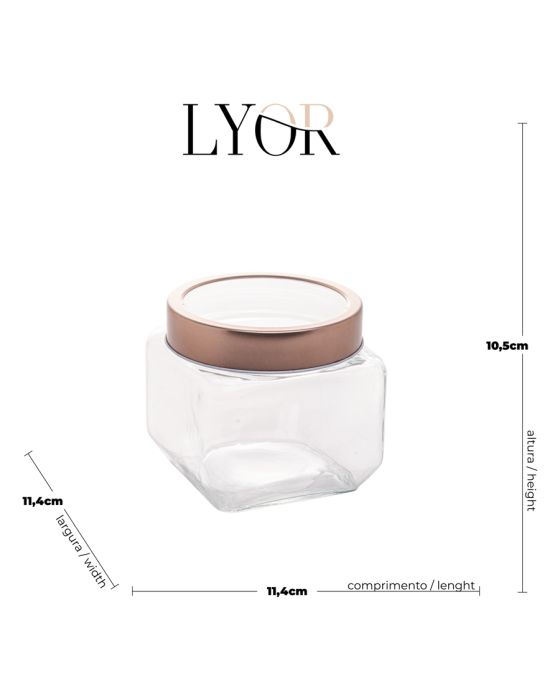 Características:O Pote de Vidro com Tampa de Metal e Acrílico Gastro Rosé de 800ml da Lyor é uma escolha elegante e prática para o armazenamento de mantimentos em grande quantidade.Tampa de Metal e Acrílico Gastro Rosé:A tampa em metal com detalhes em acrílico Gastro Rosé oferece vedação hermética, mantendo os mantimentos frescos por mais tempo e adicionando um toque moderno e sofisticado ao conjunto.Design Elegante:O design elegante do pote confere um toque refinado à sua cozinha, tornando-o uma peça versátil para diferentes estilos de decoração.Versatilidade de Uso:Além de mantimentos secos, o pote pode ser utilizado para armazenar outros itens, como doces, biscoitos ou até mesmo objetos não alimentícios.Detalhes:- Marca: Lyor;- Referência: 7525;- Modelo: Gastro;- Linha: Porta Mantimentos;- Tipo: Armazenamento;- Cor da tampa: Rosé Gold;- Cor do corpo: Incolor;- Capacidade: 800ml;- Contém: 1 unidade do produto;- Possui tampa com acrílico;- Design simples e elegante;- Produto Versátil, podendo ser usado armazenamento de diversos tipos de produtos;- Fácil de limpar.Ideal para:- Ideal para Cozinha, Copas, Lavanderias, Dispensas, lanchonetes, restaurantes, panificadora e confeitaria, hotéis e demais estabelecimentos.Limpeza e cuidados:- Lavar com detergente neutro, esponja macia e secar imediatamente;- Não lavar em máquinas e não utilizar produtos químico.Recomendações:- Este produto não pode ir ao Micro-Ondas, Lava Louças, fornos, freezer e fogões.Composição:- Fabricado em Vidro.Medidas:- Dimensões do produto: 11 x 11 x 10,5cm (CxLxA);- Peso: 0,49kg.Conteúdo da embalagem: 1 Porta Mantimento de Vidro com Tampa de Metal/Acrílico 800ml Lyor.As especificações podem ser alteradas sem aviso prévio ** Imagem meramente ilustrativa.