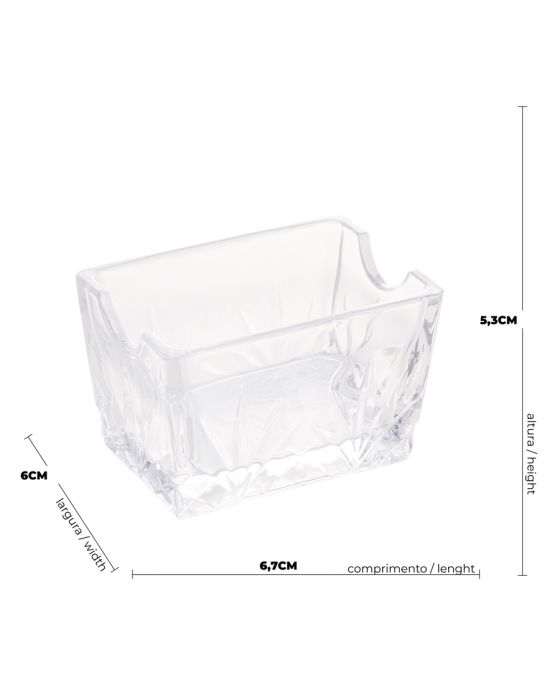 Características:O Porta Sachê de Vidro Dublin, da Lyor, é uma peça delicada que une funcionalidade e sofisticação. Com um design clássico e dimensões compactas, este porta sachê é a escolha perfeita para manter seus sachês organizados com estilo.Material de QualidadeFabricado em vidro de alta qualidade, o Porta Sachê Dublin oferece durabilidade e transparência, permitindo visualizar facilmente os sachês armazenados.Design ClássicoO formato e o acabamento clássico do Porta Sachê Dublin conferem uma estética atemporal. Ele se destaca como um elemento decorativo sutil enquanto mantém seus sachês organizados.Detalhes:- Marca: Lyor;- Modelo: Dublin;- Referência: 1175;- Linha: Porta Saches;- Tipo: Servir;- Cor: Branco com detalhes em Bambu;- Contém: 1 unidade do produto;- Tamanho: 8,5 x 6 x 5,5cm (CxLxA);- Design simples e charmoso;- Material de alta qualidade;- Design clássico.Ideal para:- Ideal para Salas de Reunião, espaço do café, lanchonetes, restaurantes, panificadora e confeitaria, hotéis e demais estabelecimentos.Limpeza e cuidados:- Limpar com flanela branca e seca; - Não lavar em máquinas e não utilizar produtos químico.Recomendações:- Este produto não pode ir ao Micro-Ondas, Lava Louças, fornos, freezer e fogões.Composição: - Fabricado em Vidro.Medidas:- Dimensões do produto: 8,5 x 6 x 5,5cm (CxLxA);- Dimensões da embalagem: x x cm (CxLxA);- Peso: 0,23kg.Conteúdo da embalagem: 1 Porta Sachê de Vidro Dublin 5,5cm x 6cm Lyor.As especificações podem ser alteradas sem aviso prévio ** Imagem meramente ilustrativa.