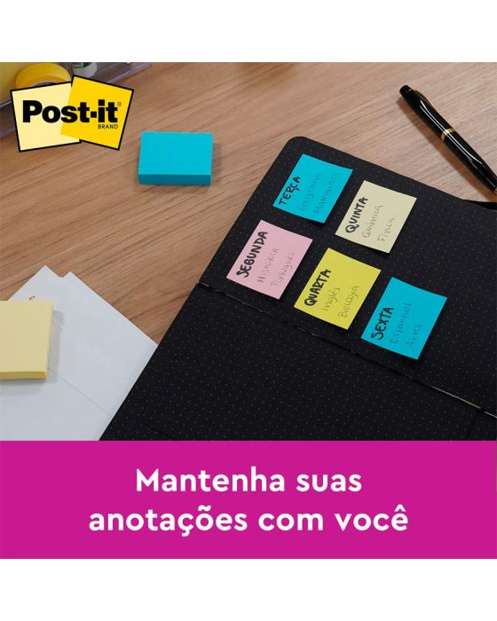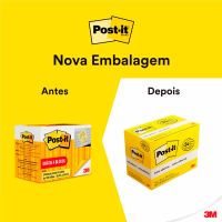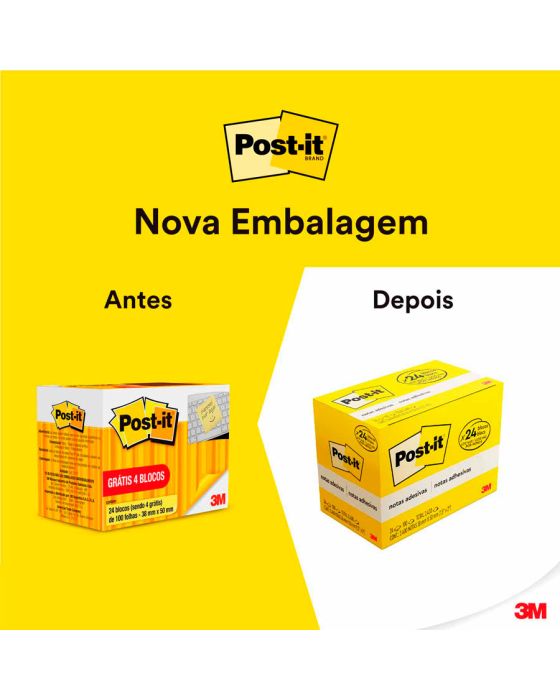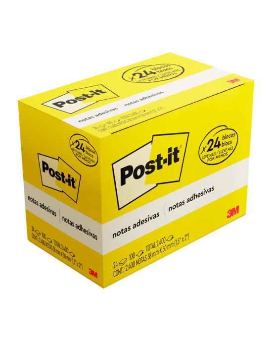 Características:Bloco de notas adesivas para anotar compromissos e recados.Detalhes:- Marca: Post-it®;- Fabricante: 3M;- Modelo: Bloco de Notas Adesivas Post-it®®- Referência: HB004088231;- Linha: Blocos de notas;- Cor: Amarelo;- Embalagem: Compre 20 e leve 24 unidades- Quantidade de folhas por bloco: 100 folhas;- Quantidade de blocos: 24 blocos;- Contém: 1 embalagem com 1 bloco de 100 folhas;- Medidas: 38 x 50mm (3,8 x 5cm);- Reciclável;- Suas folhas são reposicionáveis, pois possuem adesivo de qualidade 3M que permite que essas sejam retiradas e recolocadas sem danificar papéis ou outras superfícies;- Todo papel utilizado nas notas Post-it® é certificado pelo SFI (Chain of Custody Certified), o que garante que vem de florestas bem administradas, onde as árvores são replantadas;- Não deixa resíduos do adesivo.Aplicações sugeridas:- Cores diferentes que facilitam na organização, além de terem o tamanho ideal para anotações rápidas;- São ótimos para deixar um recado, anotar um lembrete pessoal, número de telefone ou listar tarefas.Composição:- Adesivo: Papel e adesivo acrílico.AVISO!- O adesivo pode deixar marcas em algumas superfícies ou remover tinta. Teste antes de usar!* As especificações podem ser alteradas sem aviso prévio ** Imagem meramente ilustrativa.