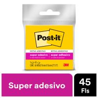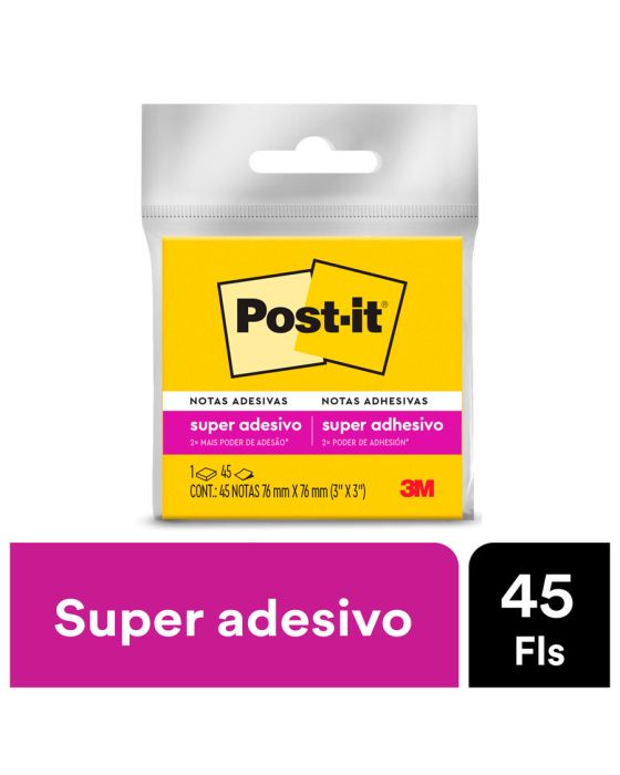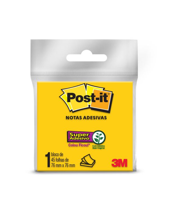 Características:As notas adesivas Post-it® tamanho 7,6 cm x 7,6 cm são ideais para anotações e recados!Suas folhas são reposicionáveis, pois possuem adesivo de qualidade 3M que permite que essas sejam retiradas e recolocadas sem danificar papéis ou outras superfícies.Detalhes:- Marca: Post-it®;- Fabricante: 3M;- Referência: HB004399398;- Linha: Blocos de notas;- Cor: Amarelo Neon;- Quantidade de folhas: 45 folhas;- Quantidade de blocos: 1 bloco;- Contém: 1 embalagem com 1 blocos de 45 folhas;- Medidas: 76 x 76mm (7,6 x 7,6cm);- Gruda e desgruda: É reposicionavel;- Adesivo ideal para o uso em papel;- Super Adesivo: O dobro de adesão Em relação ao regular;- Reciclável;- Adesivo de base vegetal.Aplicações sugeridas:- Ideal para fazer anotações e lembretes, possui diversas cores o que facilita sua organização. Possui um adesivo 2x mais forte do que o bloco Post-it® original;Composição:- Papel (75g/m²) com adesivo com base vegetal reposicionável;- Todo papel utilizado nas notas Post-it® é certificado pelo SFI (Chain of Custody Certified), o que garante que vem de florestas bem administradas, onde as árvores são replantadas.AVISO!- O adesivo pode deixar marcas em algumas superfícies ou remover tinta. Teste antes de usar!* As especificações podem ser alteradas sem aviso prévio ** Imagem meramente ilustrativa.