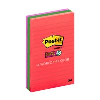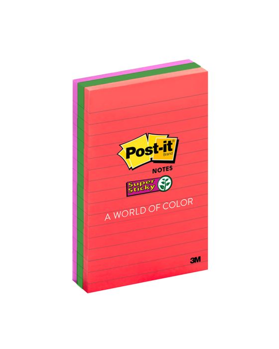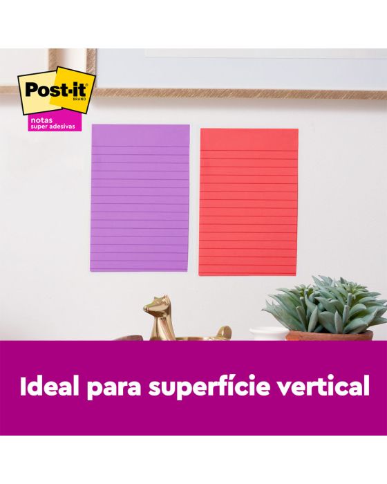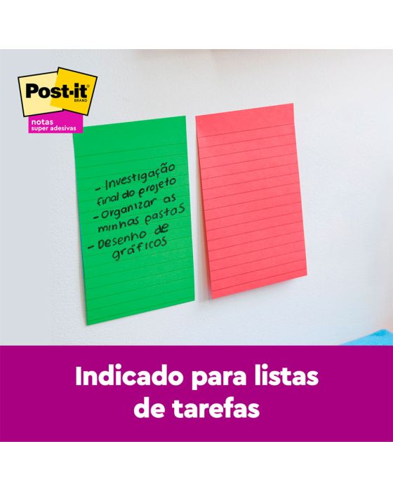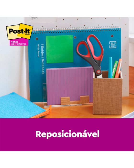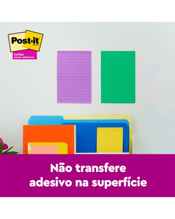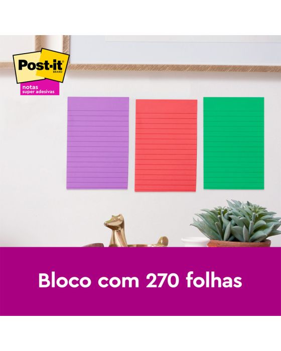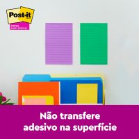 Caracteristicas:As Notas Super Adesivas Post-it® apresentam 2x maior poder de adesão. Com essas notas, você pode colar, descolar e colar novamente para mover lembretes e tarefas ao longo do dia.Você pode usar as Notas Super Adesivas Post-it®, com tamanho de 101 mm x 152 mm, para fazer anotações ou lembretes em portas, monitores, paredes ou janelas. As notas pautadas são ótimas para listas de tarefas ou mensagens mais longas. Seu adesivo exclusivo cola, descola e cola novamente de forma confiável para que sua mensagem fique no lugar que você quiser. Mova suas notas com você ao longo do dia!Detalhes:- Fabricante: 3M.- Marca: Post-it.- Coleção: Diversão.- Formato: 101 x 152mm- 90 folhas cada- Contém 3 blocos de notas coloridas com 90 folhas cada bloco (270 folhas)- Cores: Terra, Verde e Roxo- 2 vezes mais poder de adesão do adesivo.Composição: - Bloco de papel com adesivo acrilico base água.Advertências:- O adesivo pode deixar marcas em algumas superfícies ou remover tinta. As cores podem borrar quando molhadas.- Pode não ser adequado para uso em papel ou superfícies delicadas. Teste antes de usar!As notas de Post-it® são recicláveis.* As especificações podem ser alteradas sem aviso prévio ** Imagem meramente ilustrativa.