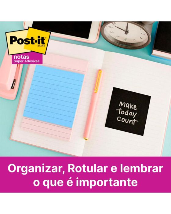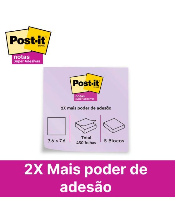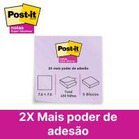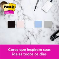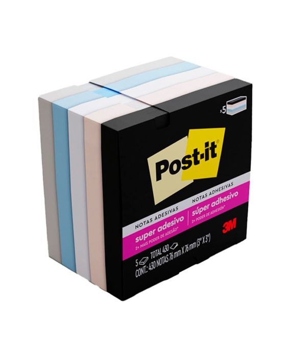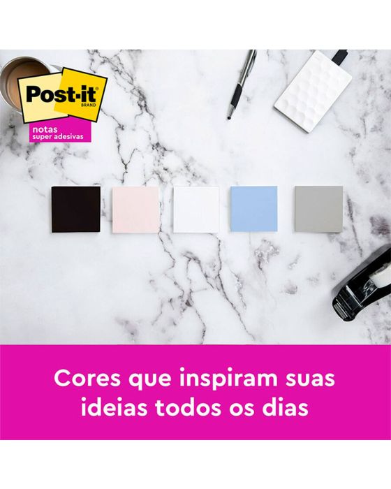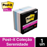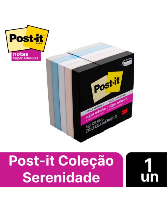 Características:Nova coleção dos famosos blocos de notas adesivas post-it® em packs com mais variedades de cores. Suas ideias e sonhos só começam a tomar forma quando sua caneta encontra o papel, porque quando você coloca suas ideias no papel, faz delas um pouco mais reais.Notas post-it® são as melhores parceiras neste ponto de conexão, é a transformação de seus pensamentos e os murais coloridos de notas post-it® que iluminam as ideias de todos. Agora com ainda mais cores para escolher, suas ideias e post-it® são melhores juntos.Suas folhas são reposicionáveis, ou seja, possuem super adesivo post-it®, que permite que sejam retirados e recolocados, sem danificar papéis ou outras superfícies, sem deixar resíduos do adesivo e sem perder a eficiência na fixação. sua embalagem é transparente e permite que você visualize a cor real do produto, além de protegê-lo, fazendo com que chegue sem nenhuma sujeira ou mancha em suas mãos. Tenha os blocos de notas adesivas post-it® sempre à mão em seu escritório ou em casa, dentro de seu caderno, da bolsa, próximo ao telefone, cabeceira da cama ou onde mais quiser.Detalhes:- Marca: Post-It;- Fabricante: 3M;- Modelo: Coleção Serenidade;- Linha: Notas Adesivas;- Cor: Preto, novo rosa, Branco, Azul e Gris;- Quantidade de folhas: 86 folhas por bloco (430 folhas no total);- Quantidade de blocos: 5 blocos com cores mistas;- Contém: 1 embalagem com 5 blocos com 430 folhas;- Formato: 76 x 76mm;- Folhas super adesivas;- 2 vezes mais poder de adesão;- Folhas reposicionáveis.Composição:- Bloco de papel com adesivo acrílico base água.Advertência:- O adesivo pode deixar marcas em algumas superfícies ou remover tinta;- As cores podem borrar quando molhadas;- Pode não ser adequado para uso em papel ou superfícies delicadas;- Produtos de limpeza podem afetar a adesão;- Teste antes de usar.As notas de Post-it® são recicláveis.* As especificações podem ser alteradas sem aviso prévio ** Imagem meramente ilustrativa.