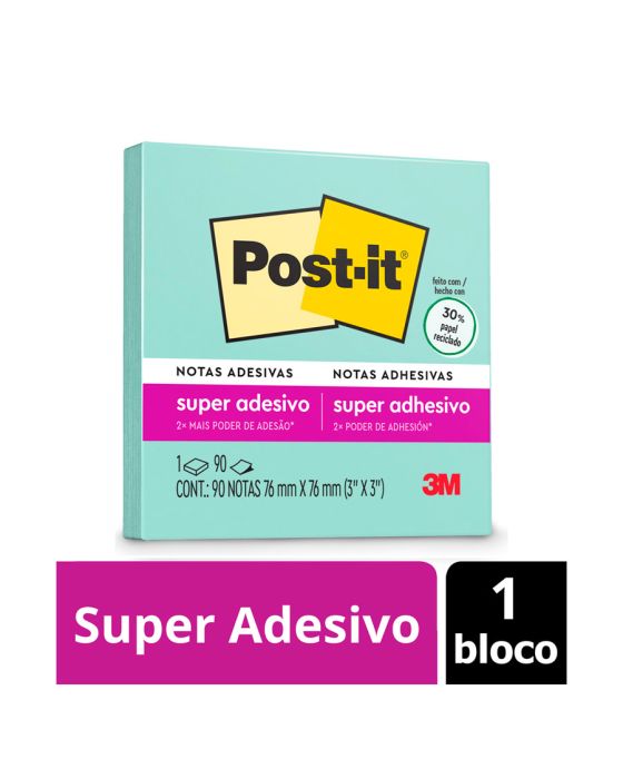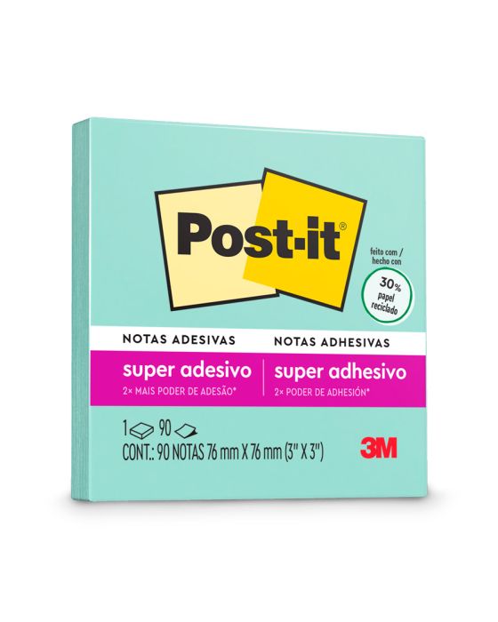 Características:As notas adesivas Post-it® tamanho 7,6 cm x 7,6cm são ideais para anotações e recados. Ideal para fazer anotações e lembretes, possui diversas cores o que facilita sua organização. Possui um adesivo 2x mais forte do que o bloco Post-it® originalDetalhes:- Marca: Post-it®;- Fabricante: 3M;- Modelo: Super Adesivas Post-it®- Referência: HB004604425;- Linha: Blocos de notas;- Cor: Menta;- Quantidade de folhas: 90 folhas;- Quantidade de blocos: 1 bloco;- Contém: 1 embalagem com 1 bloco de 90 folhas cada;- Medidas: 76 x 76mm (7,6 x 7,6cm);- Aderem e voltam a colar sem deixar resíduos;- Apresentam 2 vezes mais adesão;- Recicláveis;- Contém adesivo Command® - removível e sem estragos;- Produto Certificado: SFI (Chain of Custody Certified) o que garante que vem de florestas bem administradas, onde as árvores são replantadas.Aplicações sugeridas:- Ideal para lembretes em portas, janelas e paredes.Composição:- Papel: Papel com gramatura de 90g/m²;- Adesivo: Adesivo de base vegetal.Aplicativo Post-it®:- Baixe o aplicativo gratuito Post-it®. É a maneira perfeita de capturar e compartilhar ideias, controlar tarefas ou criar calendários coloridos com seus amigos AVISO!- O adesivo pode deixar marcas em algumas superfícies ou remover tinta. Teste antes de usar!* As especificações podem ser alteradas sem aviso prévio ** Imagem meramente ilustrativa.