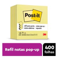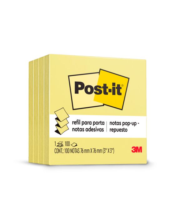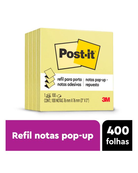 Características:O bloco de notas adesivas Post-it® refil 76 mm x 76 mm para o sistema puxa fácil tem o formato parecido com uma sanfona e, quando utilizado junto à linha de suportes sistema puxa fácil para notas, permite que você retire uma nota por vez com apenas uma mão.Detalhes:- Marca: Post-it®;- Fabricante: 3M;- Modelo: Super Adesivas Post-it®- Referência: HB004130074;- Linha: Blocos de notas;- Cor: Amarelo;- Quantidade de folhas por bloco: 100 folhas;- Quantidade de blocos: 4 blocos;- Contém: 1 embalagem com 4 bloco de 100 folhas cada totalizando 400 folhas;- Medidas: 76 x 76mm (7,6 x 7,6cm);- Organização garantida sempre com o bloco refil e suporte de nota Post-it®;- Folhas reposicionáveis;- Não deixa resíduos do adesivo;- Embalagem Promocional: com 4 blocos com 100 folhas cada;- Desconto de 25% em relação ao bloco individual com 100 folhas;- Produto Certificado: SFI (Chain of Custody Certified).Aplicações sugeridas:- O refil deve ser utilizado junto aos suportes sistema puxa fácil Post-it®, já que possui um formato parecido com safona, facilitando a retirada de uma nota por vez com apenas uma mão. Além disso, os suportes são ótimos para dar a sua cara em casa ou no escritório.Composição:- Adesivo: Adesivo de base vegetal.AVISO!- O adesivo pode deixar marcas em algumas superfícies ou remover tinta. Teste antes de usar!* As especificações podem ser alteradas sem aviso prévio ** Imagem meramente ilustrativa.