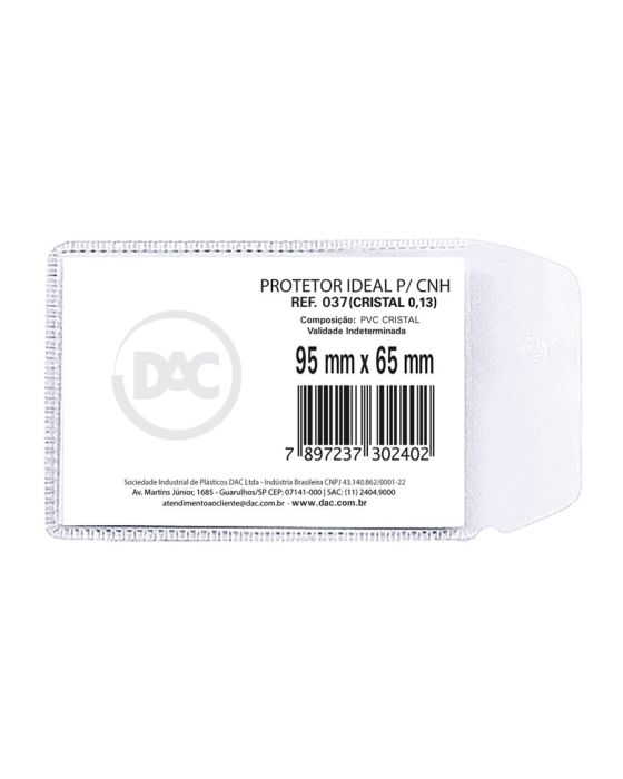 Características:Com o Protetor de Documento Multiuso com Aba DAC, você poderá proteger a sua Carteira Nacional de Habilitação (CNH) com um material de alta qualidade e durabilidade!Detalhes:- Marca: DAC;- Modelo: Protetor para Documentos DAC;- Referência: 037;- Linha: Protetor para Documentos;- Cor: Transparente/Incolor;- Formato: 6,5 x 9,5cm;- Contém: 1 embalagem com 100 unidades do produto;- Tipo de Documento: Carteira Nacional de Habilitação (CNH);- Protetor com aba em PVC Cristal em espessura 0,13.Validade Indeterminada.Ideal para: - Ideal para proteger o CNH.Composição:- Fabricado em PVC Cristal.Medidas:- Dimensões do produto: 6,5 x 9,5cm.* As especificações podem ser alteradas sem aviso prévio** Imagem meramente ilustrativa.