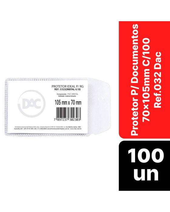 Características:A DAC é líder no segmento de protetores para documentos. Ideal para proteger o CNH e RG, com material de alta durabilidade.!Detalhes:- Marca: DAC;- Modelo: Protetor de Documento Multiuso com aba (CNH);- Referência: 032;- Linha: Protetores de Documentos;- Cor: Transparente/Incolor;- Formato: 7 x 10,5cm;- Espessura: 0,13;- Contém: 1 embalagem com 100 unidades do produto;- Protetor com aba em PVC Cristal.Validade Indeterminada.Ideal para: RG e CNH.Composição:- Fabricado em PVC Cristal.Medidas:- Dimensões do produto: 10,5 x 4cm (CxL).* As especificações podem ser alteradas sem aviso prévio** Imagem meramente ilustrativa.