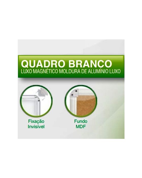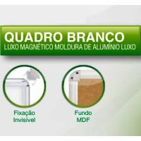 Características: Confeccionada em laminado melamínico branco lousa, sobreposta a uma chapa de mdf 3mm, com ação magnética devido a uma chapa de metal fixada entre o laminado e o mdf de 3mm. Acabamento feito com moldura de aluminio luxo anodizado com sistema de cantoneiras plásticas que proporcionam um visual mais moderno e fixação invisivel dos parafusos, podendo ser montado tanto na horizontal ou vertical. A vida útil estimada destes quadros são de 5 anos em média.- Medida: 90x60cm - Acompanha buchas, parafusos, suporte para apagador e cantoneiras plásticas.* As especificações podem ser alteradas sem aviso prévio** Imagem meramente ilustrativa.Imagem meramente ilustrativa