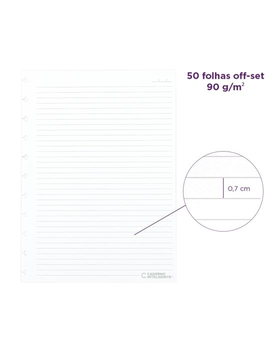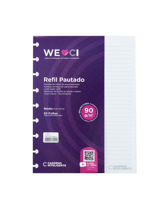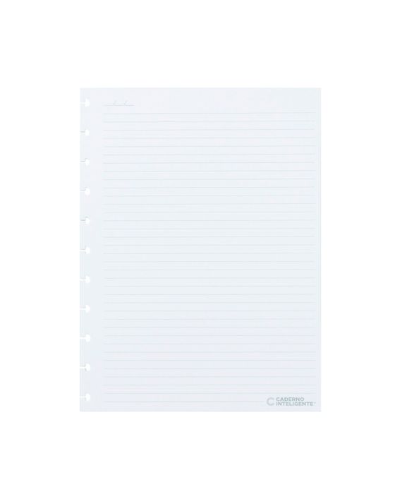 Características:Calma! Você sempre pode contar com o Caderno Inteligente!O refil pautado é composto por 50 folhas de papel pautado. E não precisa se preocupar com espaço, já que com o prático e inovador sistema de reposicionar folhas do caderno de discos, o seu Caderno Inteligente fica sempre do jeito que você quiser. Adicione mais refis para manter o seu queridinho como novo!Detalhes:- Marca: Caderno Inteligente;- Referência: CIRM3003;- Linha: Refis;- Tipo: Pautado;- Formato: Médio;- Cor: Branco;- Quantidade folhas: 50 folhas;- Contém: 1 unidade do produto;- Tamanho: 172mm X 231mm (17,5x 23,1cm);- Gramatura: 90g/m2;- Folhas: Pautada na cor cinza;- Fácil de colocar no caderno inteligente;- Papel resistente e de longa durabilidade;- Produto atóxico;- Produto original.Indústria Brasileira. | Validade: Indeterminada.Instruções de manuseio:- Segure a folha com os dedos próximos aos discos e puxe-a suavemente de cima para baixo;- Nunca puxe as folhas pela lateral, isso pode danificá-las e prejudicar o encaixe posterior;- Para recolocar uma folha, posicione-a sobre os discos e encaixe-a pressionando com os dedos;- Cada tamanho de disco comporta uma quantidade máxima de itens. Respeite esse limite para não ter problemas com folhas “se soltando”.Composição:- Fabricado em Celulose.Medidas:- Dimensões do produto: 23,1 x 17,2 x 0,6cm (CxLxA);- Peso: 160g.* Por se tratar de um produto artesanal, a tonalidade pode variar.ATENÇÃO! NÃO RECOMENDÁVEL PARA CRIANÇAS DE ATÉ 3 (TRÊS) ANOS POR CONTER PARTE(S) PEQUENA(S) QUE PODEM SER ENGOLIDA(S) OU ASPIRADA(S). * As especificações podem ser alteradas sem aviso prévio ** Imagem meramente ilustrativa.