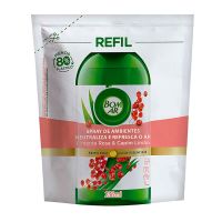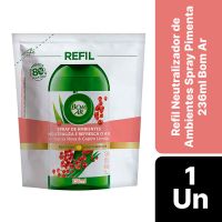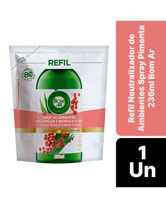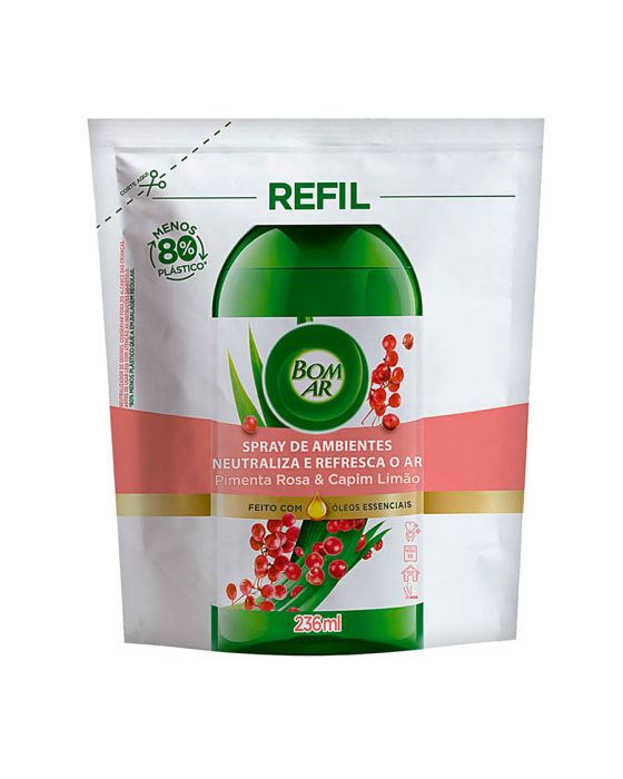 Características:O novo Spray de ambientes Bom Ar Nada além do que você precisa para neutralizar os maus odores e refrescar sua casa! Feito com poderosas moléculas capazes de neutralizar maus odores e perfumar o ambiente. Sua fragrância possui óleos essenciais naturais, o que torna ideal para neutralizar maus odores de Banheiro, Cozinha, Animais domésticos, Cigarro e Frituras!Detalhes:- Marca: Bom Ar®;- Fabricante: Reckitt Beckiser;- Linha: Neutralizador de Ambientes;- Tipo: Refil;- Fragrância: Pimenta Rosa e Capim Limão;- Volume/Peso: 236ml;- Contém: 1 embalagem com 1 refil de 236ml;- Livre de gases e propelentes, corantes e acetona;- Feito com óleos essenciais;- 80% menos plástico que a embalagem anterior;- Ambientes sempre perfumados.Indústria Brasileira. | Validade: Refil válido por 24 meses após a data de fabricação impressa na embalagem.Ideal para:- Banheiro, Cozinha, Animais domésticos, Cigarro e Frituras.Modo de uso:- Corte a embalagem no lugar indicado;- Despeje o conteúdo no frasco;- Encaixe o gatilho novamente e rosqueie para fechar.* Necessário comprar primeiro o frasco pulverizador (SKU 101864), depois aproveite a economia do refil.Recomendações:- Não borrifar diretamente nas superfícies, alimentos e tecidos;- Não borrifar em animais de estimação, camas ou alojamentos para animais de estimação;- Escorregadio em superfícies lisas, algumas superfícies lisas podem ficar úmidas quando pulverizadas;- Em caso de contato com superfícies, limpe imediatamente com pano úmido.Conservação:- Armazene em lugar seco e fresco.Composição:- Tensoativo não iônico, coadjuvantes, fragrância e veículo.Medidas:- Dimensões da embalagem: 12 x 5 x 14,5cm (CxLxA);- Peso: 236g.IMPORTANTE! CONSERVAR FORA DO ALCANCE DE CRIANÇAS E ANIMAIS DOMÉSTICOS.* As especificações podem ser alteradas sem aviso prévio ** Imagem meramente ilustrativa.
