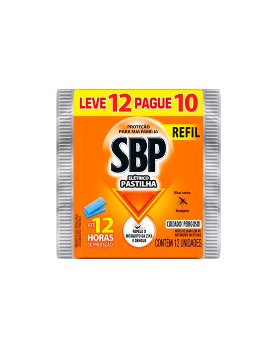 Características:O Refil SBP Elétrico Pastilha é a maneira de repor o repelente elétrico de uma forma mais econômica e inteligente. O refil que contém novas pastilhas, protege o seu ambiente por até 12 horas e é eficaz contra pernilongos e mosquitos, incluindo o Aedes aegypti, Mosquito transmissor da Dengue, Zika e Chikungunya, mantendo-os afastados.Detalhes:- Marca: SBP.- Modelo: Refil.- Proteção: 12 horas de proteção.- Conteúdo da embalagem: 12 unidades.- Pastilha para aparelho aparelho elétrico pastilha 12 horas SBP.- Eficaz contra:- Mosquitos da Zika, Chikungunya e Dengue.Modo de usar:- Retire a pastilha do envelope.- Introduza a pastilha sob a grade de proteção do aparelho.- Coloque o aparelho na tomada.- Após 12 horas, substitua o refil.Utilize em ambientes como:- Quarto/ Quarto de crianças.- Sala de estar.Observações:- O refil irá perder a cor azul, indicando o consumo do produto.- Para ambientes maiores de 10m2, utilize mais de um aparelho.- Manter uma porta ou janela para que os insetos possam sair.- Evite correntes de ar que diminuam a eficiência do produto.Composição:- INGREDIENTE ATIVO: Esbiotrina 20mg/pastilha (equivale a 22,22% por unidade)- Ingrediente ativo, Corante e Solventes.RECOMENDA-SE QUE AS CRIANÇAS SEJAM VIGIADAS PARA ASSEGURAR QUE ELAS NÃO ESTEJA, BRINCANDO COM O APARELHO.ESTE APARELHO NÃO DEVE SER UTILIZADO POR PESSOAS (INCLUINDO CRIANÇAS) COM CAPACIDADES FÍSICAS, MENTAIS E SENSORIAIS REUZIDAS, OU SEM EXPERIÊNCIA E CONHECIMENTO, AO MENOS QUE SEJAM SUPERVISIONADAS. * As especificações podem ser alteradas sem aviso prévio ** Imagem meramente ilustrativa.