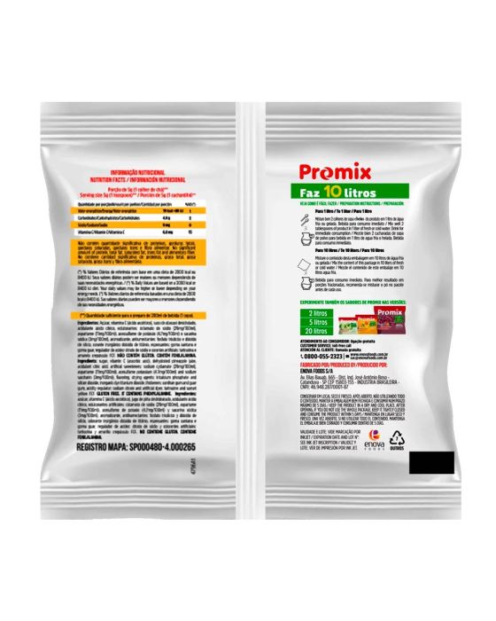 Caracteristicas:Excelente rendimento apresentado em 10 sabores para compartilhar com os amigos e família, porque sempre tem um bom motivo para comemorar. Promix traz praticidade, rendimento, refrescância e sabor para matar a sede de todos.Detalhes:- Marca: Promix.- Linha: Refresco em pó.- Sabor: Laranja.- Peso: 250g.- Faz: 10 Litros.- Excelente custo-benefício.– Melhor balanço sensorial com polpa de fruta.- Já vem adoçado na medida certa– Melhor rendimento e fácil dissolução.– Baixo teor de sódio.– Fonte de vitamina C.– Apenas 19Kcal por copo.Modo de preparo:Para 1 Litro:- Misture bem duas colheres de sopa cheias do produto em 1 litro de água fria ou gelada.- Bebida para consumo imediato.Para 10 Litros:- Misture o conteúdo desta embalagem em 10 litros de água fria ou gelada.- Bebida para consumo imediato.- Para melhor resultado em porções fracionadas, recomenda-se misturar o pó no pacote antes de cada uso.Ingredientes:- Açúcar, vitamina C (ácido ascórbico), polpa de laranja desidratada, acidulante ácido cítrico, edulcorantes: ciclamato de sódio (23mg/100ml), aspartame (9mg/100ml), acessulfame de potássio (4,1mg/100ml) e sacarina sódica (1,5mg/100ml), aromatizante, antiumectantes: fosfato tricálcico e dióxido de silício, corante inorgânico dióxido de titânio, regulador de acidez citrato de sódio, espessantes: goma xantana e carboximetilcelulose sódica, corantes artificiais: tartrazina e amarelo crepúsculo FCF, corante caramelo IV.* As especificações podem ser alteradas sem aviso prévio ** Imagem meramente ilustrativa.