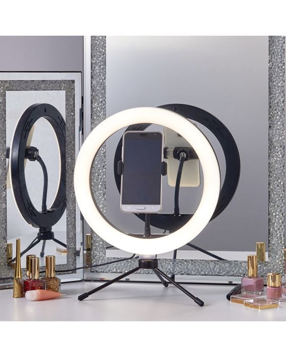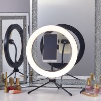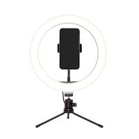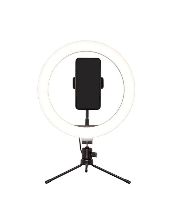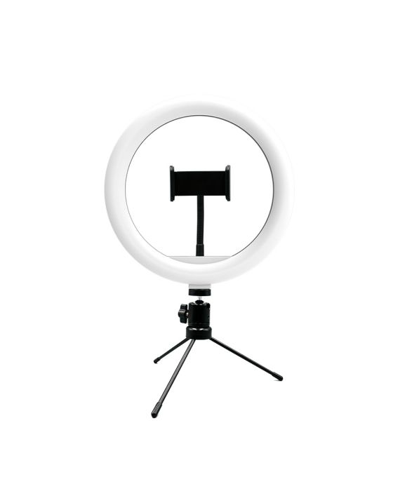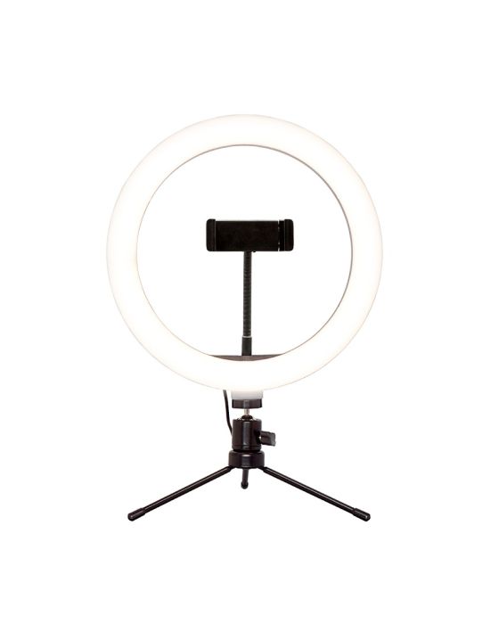 Caracteristicas:Ring Light com controle de intesidade integrado para suas fotos ficarem ainda mais lindas. Conta com suporte ajustável e rotação em 360 graus, assim a sua pose será registrada no melhor ângulo.- Conexão USB- Possui Tripé de Mesa: (Altura Máx: +/- 18cm / Altura Mín +/- 10cm / Somente o Tripé montado) )- Suporte ajustável para smartphone com alça emborrachada- Luz ajustável: 360º de rotação- Controles integrados: Liga/Desliga, ajusta o brilho e tipo de iluminação- Potência: 11W- Eficiência Luminosa: 40-lm/W- Diâmetro do Ring Light: 26cm- Comprimnento do Cabo: 2m- Tensão de entrada: 5V/1.6A- Material: Aço Carbono, Plástico ABS e liga de aluminío- Dimensões: (LxAxC) 3,5 x 40,5 x 25,5cm- Peso: 1200g- Garantia: 1 ano contra defeitos de fabricação- Conteúdo da embalagem: Ring Light com Cabo e controle, Tripé , Haste com suporte para Smartphone, Ajustador de inclinação e Manual do usuárioObs: Não acompanha Smartphone (Imagens meramente ilustrativas)* As especificações podem ser alteradas sem aviso prévio ** Imagem meramente ilustrativa.