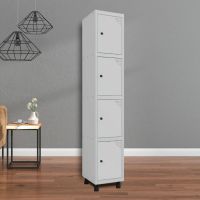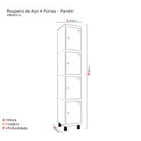 Características:O roupeiro de aço é um móvel com múltiplas funções. Isso porque ele serve tanto para composições menores como no quarto ou closet, quanto para guardar pertences em ambientes guarda volumes, em empresas, hospitais, supermercados e etc. Recomendado também na montagem de vestíarios de academias, estúdios de pilates, entre outros.Com excelente espaço interno pode ser usado também em escolas e universidades, armazenando pertences com segurança e praticidade, além de serem móveis duráveis e resistentes.Detalhes:- Marca: Pandin;- Modelo: GRP501/4;- Linha: Roupeiro de Aço;- Cor: Cinza;- Portas: 4 portas;- Material: Aço;- Fechamento por pitão (dispositivo para cadeado) na cor preta;- Fechadura tipo Yale;- Roupeiro de aço totalmente montável com travas invertidas tipo unha de gato que dispensa a utilização de parafusos;- 1 veneziana por porta para ventilação, cabides de encaixe, pés reguláveis em polipropileno de alto impacto na cor preta, com fixação através de canaletas, oferecendo assim maior segurança ao usuário;- Sistema de fechamento por varão em 3 pontos.Onde usar:- Escolas, universidades, supermercados, empresas, guarda volumes, hospitais, quarto e closets.Estrutura:- Confeccionado em chapa de aço nº 26 (0,45mm)Acabamento:- Tratado pelo processo anti-corrosivo à base de fosfato de zinco e pintura eletrostática a pó com camada de 30 a 40 mícrons com secagem em estufa a 240 ºC (na cor cinza cristal) ou pintura em esmalte sintético com camada de 30 a 40 mícrons com secagem em estufa a 120 ºC.Medidas:- Largura: 34,5cm.- Altura: 193cm.- Profundidade: 40cm.* Produto enviado desmontado.* As especificações podem ser alteradas sem aviso prévio ** Imagem meramente ilustrativa.
