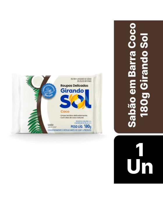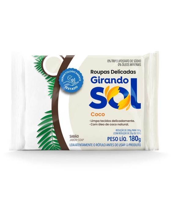 Características:O Sabão é um produto de limpeza essencial para manter nossa casa limpa e organizada, já que ele desempenha um papel fundamental na manutenção da higiene e na remoção de sujeira e manchas. Por isso, a Girando Sol desenvolveu os sabões em barra para facilitar ainda mais a rotina do seu dia a dia com melhores resultados.Detalhes:- Marca: Girando Sol;- Linha: Sabão em barra;- Tipo embalagem: Individual;- Fragrância: Coco;- Peso: 180g;- Contém: 1 unidade do produto;- Dermatologicamente testado;- Limpa tecidos delicadamente;- Com óleo de coco natural;- 0% Tripolifosfato de sódio e Óleos minerais;- Água pode faltar, não desperdice.Indústria Brasileira. | Validade: 24 meses após a data de fabricação.Modo de usar:- Esfregue o sabão Girando Sol sobre a roupa umedecida;- Na limpeza de utensílios, aplique uma pequena quantidade sobre uma esponja umedecida e esfregue no objeto a ser limpo;- Em ambos os casos, enxágue em seguida.Conservação:- Conservar em local seco e fresco.Recomendações:- Não ingerir;- Evite o contato prolongado com a pele depois de utilizar este produto.Composição:- Sebo bovino, Óleo de babaçu, Glicerina, Alcalinizante, Sequestrante, Cargas, Corantes, Fragrâncias e Veículo.Medidas:- Dimensões do produto: 8,8 x 4 x 3,7 (CxLxA);- Peso: 180g.ATENÇÃO! MANTENHA FORA DAS CRIANÇAS E DOS ANIMAIS DOMÉSTICOS.* As especificações podem ser alteradas sem aviso prévio ** Imagem meramente ilustrativa.