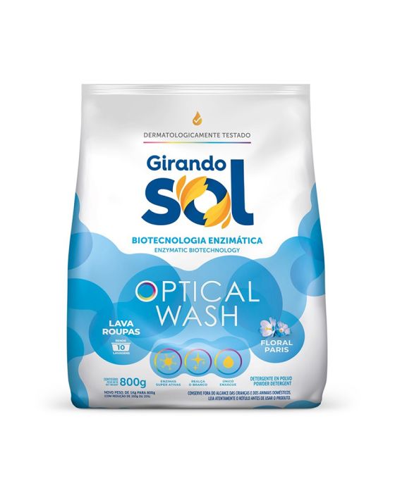 Características - Detergente em Pó Girando Sol - Sachê de 800G - Cor: Azul / Floral Paris - Produto Ecológico - NÃO CONTÉM TRIPOLIFOSFATO DE SÓDIO. - Produto Biodegradável - Preserva o oxigênio das águas. - Cuida e perfuma suas roupas. - Com enzimas superativas. - Para todo tipo de máquina.Modo de Usar - Leia as instruções na etiqueta da roupa. - Separe as roupas brancas das coloridas. - IMPORTANTE: Para aproveitar ao máximo o seu produto e obter os melhores resultados de limpeza, rendimento e perfumação, use sempre a dosagem recomendada. - ATENÇÃO: não coloque o produto direto sobre o tecido. Dissolva-o na água e depois coloque a roupa. - Para obter melhores resultados, recomenda-se deixar a roupa de molho por 1 hora. - Nunca deixe suas roupas de molho ao sol. - Seque as roupas brancas à luz natural e as coloridas à sombra.Precauções - CONSERVE FORA DO ALCANCE DAS CRIANÇAS E DOS ANIMAIS DOMÉSTICOS. - Não ingerir. - Evite inalação ou aspiração, contato com os olhos. - Evite o contato prolongado com a pele. - Depois de utilizar este produto, lave e seque as mãos. - Em caso de contato com os olhos ou com a pele, lave imediatamente com água em abundância. - Em caso de ingestão, não provoque vômito e consulte imediatamente o Centro de Intoxicações ou o médico, levando o rótulo do produto. - Manter o produto em sua embalagem original. - Não reutilizar a embalagem vazia para outros fins. Composição Química - Composição: Tensoativo Aniônico, Coadjuvantes, Sinergistas, Branqueadores Ópticos, Enzimas, Corante, Fragrância e Água. - Princípio Ativo: Dodecil Benzeno Sulfonato de Sódio. * As especificações podem ser alteradas sem aviso prévio ** Imagem meramente ilustrativa