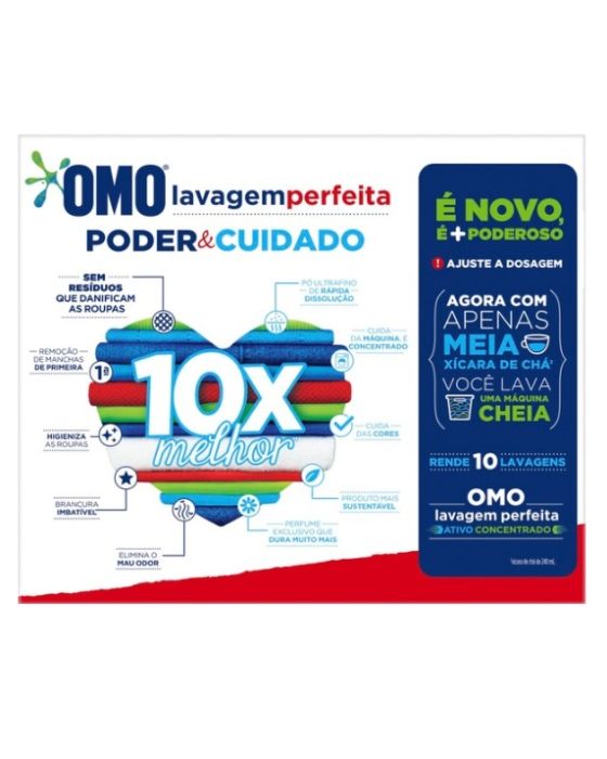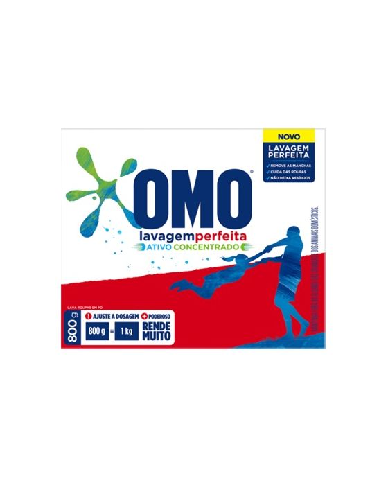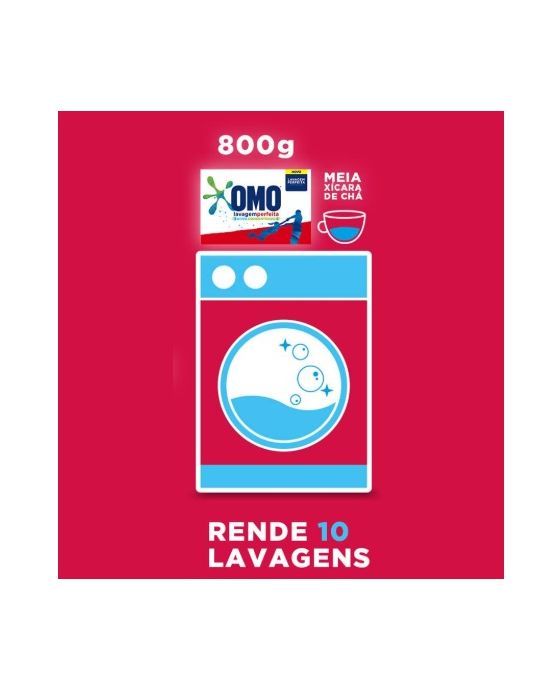 Caracteristicas:O novo OMO foi totalmente reformulado e está mais poderoso, com seu pó ultrafino que permite remover as manchas de primeira, cuidar das cores e não deixa resíduos. Por isso a dosagem deve ser ajustada para apenas meia xícara, que é suficiente para lavar uma máquina cheia.- Disponível em caixas de 800g - Marca: OMO / Linha Lavagem Perfeita - Fabicante: Unilever - Manter fora do alcance das crianças - Armazenar em local seco e fresco - Com seu pó ultrafino, dissolve rapidamente não deixando resíduos que danificam a roupas. - Cuida das cores da sua roupa. - Remove as manchas na primeira lavagem. - Tem um perfume exclusivo que dura por muito mais tempo. - É um produto mais sustentável. - Com apenas meia xícara, você lava uma máquina cheia. * As especificações podem ser alteradas sem aviso prévio ** Imagem meramente ilustrativa.