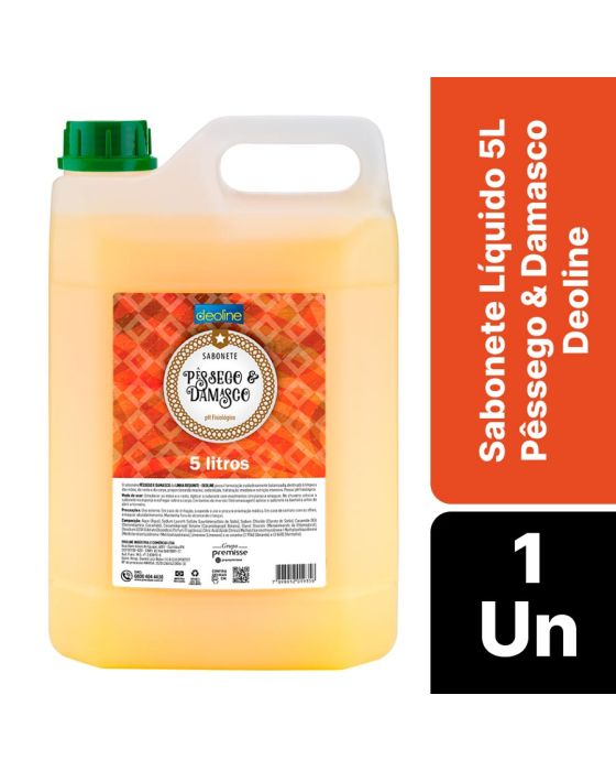 Caracteristicas:O sabonete Pêssego e Damasco da linha Requinte Deoline possui formulação cuidadosamente balanceada, destinada á limpeza das mãos, do rosto e do corpo, proporcionando maciez, sedosidade, hidratação imediata e nutrição intensiva. Detalhes:- Marca: Deoline.- Modelo: Requinte.- Linha: Sabonete Líquido.- Fragrância: Pêssego e Damasco.- Quantidade: 5L.- Peso: 5,18 Kg.- pH 100% : 5,0 – 7,0.- Possui pH fisiológico.- Aparência: Líquido laranja perolado.- Odor: Perfumado.- Diluição: Pronto para usar. Sem diluir.Modo de usar:- Umedecer as mãos e o rosto.- Aplicar o sabonete com movimentos cuirculares e enxaguar.- No chuveiro colocar o sabonete na esponja e esfregar sobre o corpo.- Em banhos de imersão (hidromassagem) aplicar o sabonete na banheira antes de abrir a torneira.Composição: - Água, Lauriletersulfato de sódio, Ccloreto de Sódio, Dietanolamina Cocamida, Cocamidopropil Betaína, Monoestrato de Etilenoglicol, Edetato Dissódico, Fragrância, Ácido Cítrico, Metilcloroisotiazolinona / Metilisotiazolinona, Limoneno, e os coranes CI 19140 (Amarelo) e ci 16185 (Vermelho).Precauções:- Uso Externo.- Em caso de irritação, suspensa o uso e procure orientação médica.- Em caso de contato com os olhos, enxaguar abundantemente.MANTENHA FORA DO ALCANCE DE CRIANÇAS!* As especificações podem ser alteradas sem aviso prévio ** Imagem meramente ilustrativa.