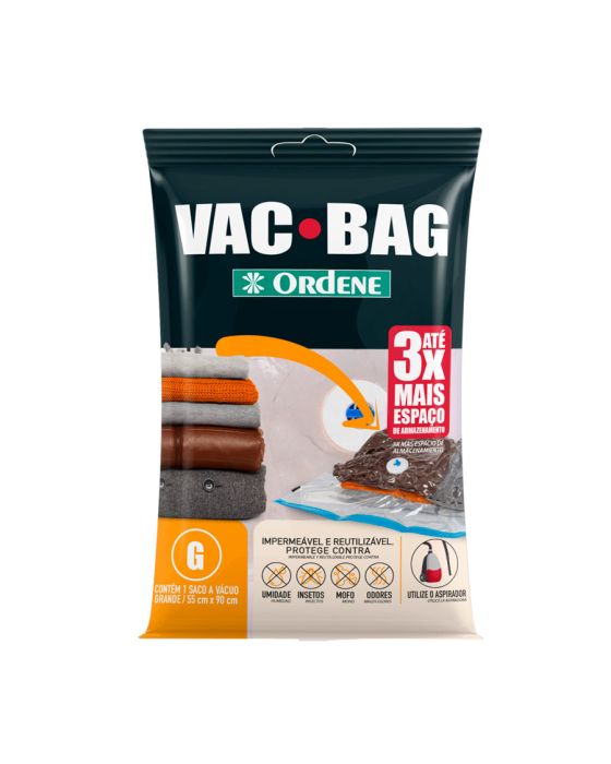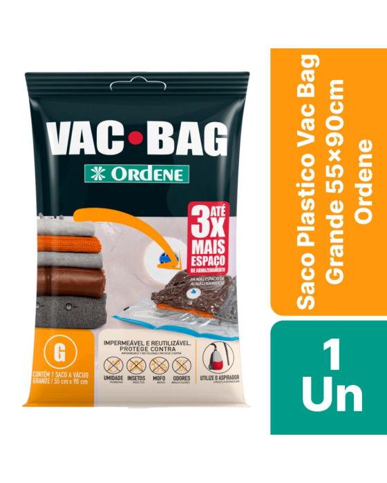 Características:O Vac Bag é ideal para guardar edredons, travesseiros, cobertores, casacos e etc, possui sistema a vácuo que permite triplicar o espaço de armazenamento. É reutilizável, impermeável e prático, protege suas peças da umidade, poeira, mofo, sujeita e insetos. Fácil de utilizar, você pode retirar o ar com aspirador de pó ou com nossa Bomba Plástica para Vac Bag.Detalhes:- Marca: Ordene;- Modelo: Saco Plastico Vac Bag Grande;- Referência: 55400;- Linha: Organizadores;- Cor: Preta;- Contém: 1 embalagem com uma unidade do produto;- Tamanho: 55 x 90cm- Triplique seu espaço de armazenamento;- Reutilizável, Impermeável, Prático, Compacta, Protege e Organiza;- Protege contra: Umidade, Mofo, Poeira, Odores, Sujeira,Insetos.Ideal para: - Ideal para armazenar travesseiros, edredons, cobertores, casacos e muito mais.Modo de usar:- Utilize o aspirador ou a Bomba Para Vac Bag Ordene.Composição: - Fabricado em 100% Polietileno.Medidas:- Dimensões do produto: 55 x 90cm.* Não acompanha a Bomba para Vac Bag, este deve ser adquirido separadamente.* As especificações podem ser alteradas sem aviso prévio** Imagem meramente ilustrativa.