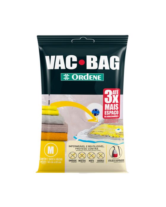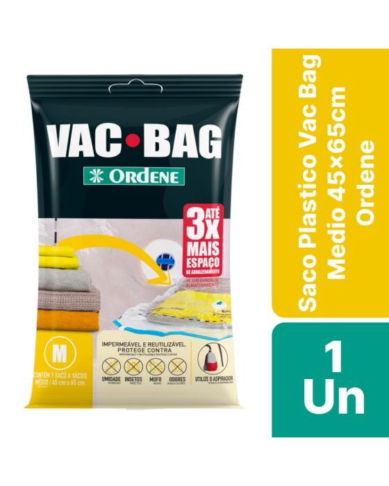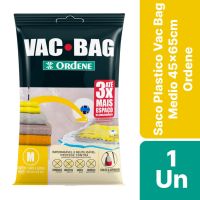 Características:O Vac Bag é ideal para guardar edredons, travesseiros, cobertores, casacos e etc, possui sistema a vácuo que permite triplicar o espaço de armazenamento. É reutilizável, impermeável e prático, protege suas peças da umidade, poeira, mofo, sujeita e insetos. Fácil de utilizar, você pode retirar o ar com aspirador de pó ou com nossa Bomba Plástica para Vac Bag.Detalhes:- Marca: Ordene;- Modelo: Saco Plastico Vac Bag Medio;- Referência: 55200;- Linha: Organizadores;- Cor: Preta;- Contém: 1 embalagem com uma unidade do produto;- Tamanho: 45 x 65cm;- Triplique seu espaço de armazenamento;- Reutilizável, Impermeável, Prático, Compacta, Protege e Organiza;- Protege contra: Umidade, Mofo, Poeira, Odores, Sujeira,Insetos.Ideal para: - Ideal para armazenar travesseiros, edredons, cobertores, casacos e muito mais.Modo de usar:- Utilize o aspirador ou a Bomba Para Vac Bag Ordene.Composição: - Fabricado em 100% Polietileno.Medidas:- Dimensões do produto: 45 x 65cm.* Não acompanha a Bomba para Vac Bag, este deve ser adquirido separadamente.* As especificações podem ser alteradas sem aviso prévio** Imagem meramente ilustrativa.