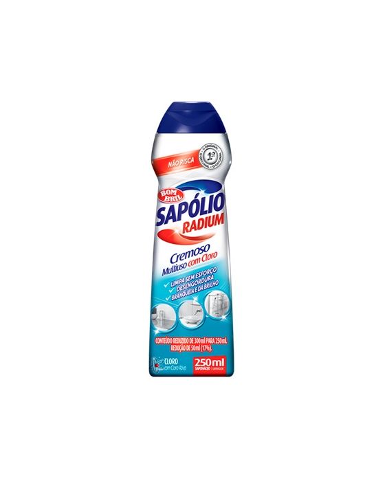 Carateristicas:Sapólio Radium Cremoso Cloro 250mlLimpador em creme, Limpa e dá brilho sem riscar, não existe nada mais eficiente para acabar com a gordura acumulada nas panelas, frigideiras, assadeiras, grelhas e peças do fogão do que Sapólio Radium Cremoso Original. Você usa e a sujeira desaparece de vez, deixando os utensílios limpos e brilhando, como se fossem novos. Sapólio Radium existe há mais de 40 anos e ainda é o melhor na limpeza pesada.DICA: - Metais: pás, talheres, maçanetas, torneiras e outras peças ficam lindas quando tratadas com Sapólio Radium Cremoso. Faça o teste! - Tênis: para limpar tênis branco de couro, use a Esponja Bom Bril Multiuso com um pouquinho de Sapólio Radium Cremoso. Retire com um pano úmido e deixe secar à sombra. - Variedade: Saponáceo Cremoso - Versão: Linha com Cloro - Capacidade: 2550mL - Marca: Sapólio Radium - Peso: 250 gramas - Dimensões: 4 x 6,4 x 21,0 cm / A x L x PCOMPOSIÇÃO: Tensoativos aniônicos e não iônicos, espessante, alcalizantes, abrasivo, preservante, pigmentos, fragrância e veículo. Componente ativo linear alquilbenzeno sulfonato de sódio. * As especificações podem ser alteradas sem aviso prévio ** Imagem meramente ilustrativa