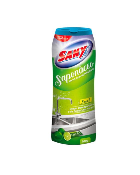 Caracteristicas:Auxiliam na remoção da sujeira mais difícil, facilitando a limpeza.Detalhes:- Marca: Sany.- Linha: Saponáceo em Pó.- Fragrância: Limão.- Volume: 300g.- Produto não inflamável.- Recomenda-se o uso de luvas.Onde usar:- Ideal para limpar pisos, lajotas, mármores, granitos, azulejos, cubas, pias, torneiras, balcões. Também recomendado para louças sanitárias e boxes.Conservação:- Condições de armazenamento adequadas: Manter o produto em local fresco, seco e bem ventilado. Manter os recipientes bem fechados e devidamente identificados. O local de armazenamento deve ter piso impermeável e isento de materiais combustíveis. Armazenar/transportar sempre abaixo de 50ºC.Composição:- Princípio ativo, Alcolinizantes, Agente abrasivo, Essência, Lauril, Sulfato de Sódio.- Contém tensoativo biodegradável.* As especificações podem ser alteradas sem aviso prévio ** Imagem meramente ilustrativa
