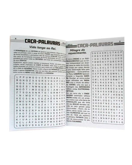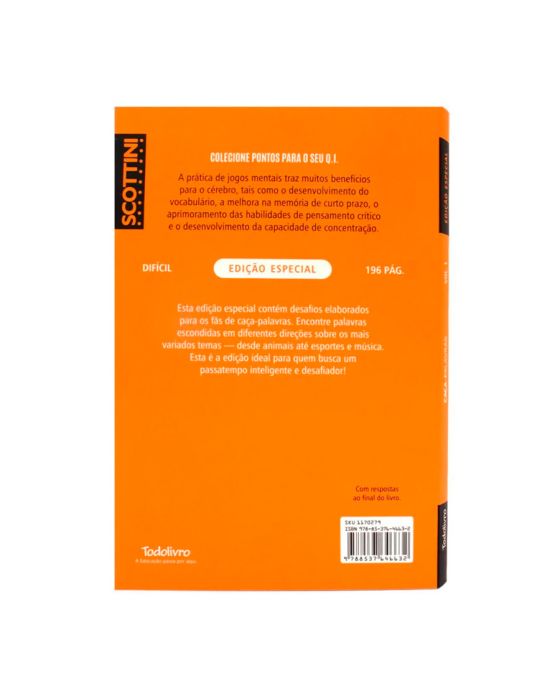 Características:A prática de jogos mentais traz muitos benefícios para o cérebro, tais como o desenvolvimento do vocabulário, a melhora na memória de curto prazo, o aprimoramento das habilidades de pensamento crítico e desenvolvimento da capacidade de concentração. Esta edição especial contém desafios elaborados para os fãs de caça-palavras. Encontre palavras escondidas em diferentes direção sobre os mais variados temas - desde animais até esportes e música. Esta é a edição ideal para quem busca um passatempo inteligente e desafiador!Detalhes:- Marca: Scottini- Fabricante: Todolivro- Modelo: Caça Palavras- Referência: 1170279- Linha: Livros- Volume: Volume 1- Capa: Capa flexível com laminação fosca e detalhes metalizados em prata- Quantidade de folhas: 196 folhas- Contém: 1 unidade do produto- Formato: 13,5 x 20,5cm- Dificuldade: Difícil- Com respostas ao final do livro- Edição especialMedidas:- Dimensões do produto: 20,5 x 13,3 x 1,1cm (CxLxA);* As especificações podem ser alteradas sem aviso prévio ** Imagem meramente ilustrativa.