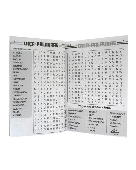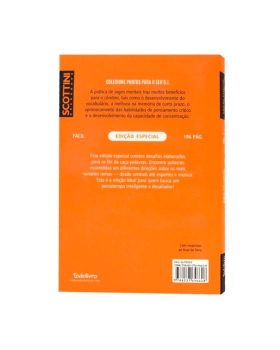Características:A prática de jogos mentais traz muitos benefícios para o cérebro, tais como o desenvolvimento do vocabulário, a melhora na memória de curto prazo, o aprimoramento das habilidades de pensamento crítico e desenvolvimento da capacidade de concentração. Esta edição especial contém desafios elaborados para os fãs de caça-palavras. Encontre palavras escondidas em diferentes direção sobre os mais variados temas - desde animais até esportes e música. Esta é a edição ideal para quem busca um passatempo inteligente e desafiador!Detalhes:- Marca: Scottini- Fabricante: Todolivro- Modelo: Caça Palavras- Referência: 1170252- Linha: Livros- Volume: Volume 1- Capa: Capa flexível com laminação fosca e detalhes metalizados em prata- Quantidade de folhas: 196 folhas- Contém: 1 unidade do produto- Formato: 13,5 x 20,5cm- Dificuldade: Fácil- Com respostas ao final do livro- Edição especialMedidas:- Dimensões do produto: 20,5 x 13,3 x 1,1cm (CxLxA);* As especificações podem ser alteradas sem aviso prévio ** Imagem meramente ilustrativa.