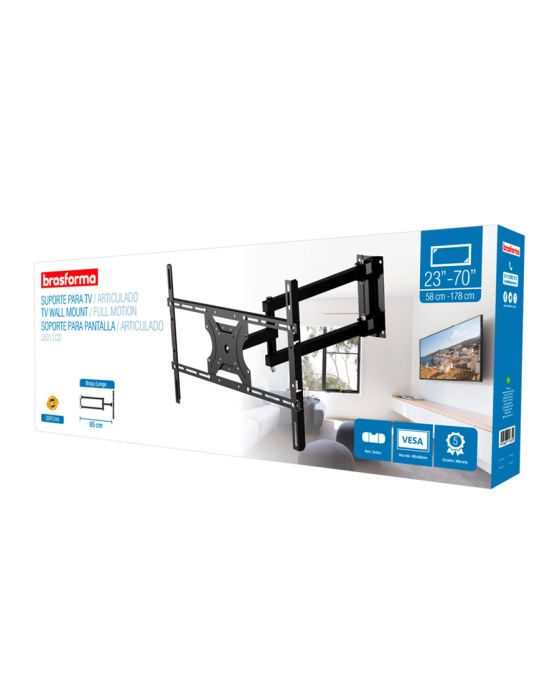 Caracteristicas:Com o Suporte Articulado para TV LED / LCD Brasforma, você poderá ajustar a TV para assistir de vários ângulos, sendo o suporte ideal para salas, escritórios, quartos, hospitais, restaurantes, entre outros locais.Detalhes:- Marca: Brasforma;- Modelo: Suporte Articulado para TV LED / LCD de 10 a 70 Brasforma SBRP 1440;- Referência: SBRP1440;- Tipo: Suporte para TV;- Cor: Preto;- Polegadas: 10 a 70 polegadas;- Carga máxima: 30kg;- Contém: 1 unidade do produto;- Produto já vem montado;- Organizadores de cabos;- Permite visão modo retrato e paisagem com rotação de 360°;- Fácil instalação;- Permite ajuste de nível.Geral:- Tipo: Articulável e Inclinável: Para visão frontal, lateral e superior;- Polegadas: 10 - 70;- Distância mínima da parede: 7,8 cm;- Distância máxima da parede: 49 cm;- Inclinação: 15°;- Articulação: 180°.Instalação:- Local de Instalação: Parede;- Furação VESA: 50x50, 75x75, 100x100, 200x100, 200x200, 300x200, 300x300, 400x100, 400x400, 600x400mm;- Pontos de fixação: 4 pontos;- Parafusos: M6x20mm, M8x25mm.Composição: - Fabricado em aço carbono, tratamento anticorrosivo e pintura eletrostática.Recomendações:- Verifique se a superfície de instalação apresenta resistência suficiente para uma instalação segura;- Fique atento a carga máxima indicada para o suporte;- Aconselhamos que a instalação seja realizada por um profissional da área;- Verifique se a furação de sua TV é compatível com o suporte.Medidas:- Dimensões da embalagem: 66,5 x 20,5 x 8cm (CxLxA);- Peso embalagem: 3,431kg.Conteúdo da embalagem: 1 Suporte para TV, Kit de Parafusos e 1 Manual de instruções.Garantia do fornecedor: 5 anos cobre defeitos de fabricação, material, peças e a respectiva mão de obra para o conserto, após a devidacomprovação pelos técnicos credenciados.* As especificações podem ser alteradas sem aviso prévio ** Imagem meramente ilustrativa.