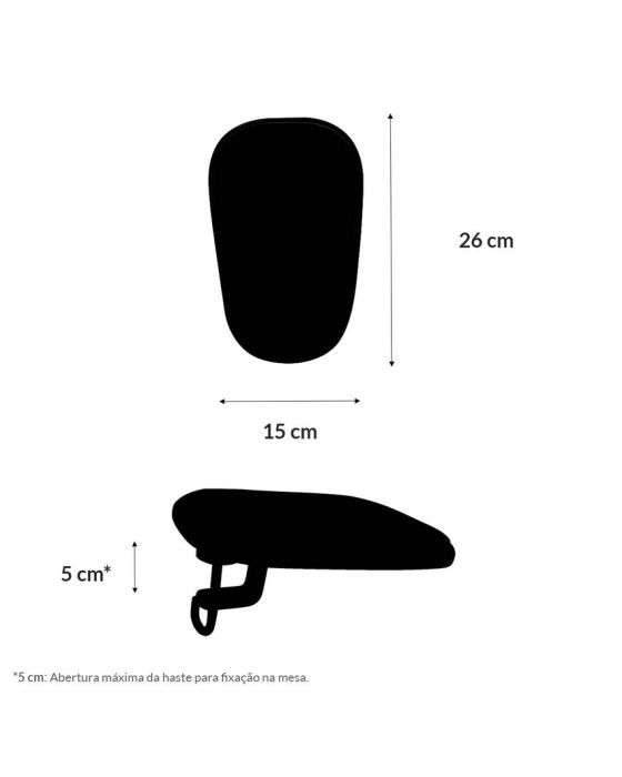 Caracteristicas:Produto com Laudo Ergonômico emitido por Fisioterapeuta do Trabalho, em conformidade com a Norma Regulamentadora (NR17).Possibilita a Posicionamento Correto do Antebraço em mesas com espaço limitadoPara que o posicionamento do seu braço esteja correto, toda a base do antebraço deve estar apoiada sobre uma superfície reta e plana. Caso o seu antebraço esteja angulado e mal posicionado, seu punho ficará tensionado, bem como a região muscular da nuca, ombros e pescoço (podendo resultar em uma lesão) e sua circulação sanguínea nesta região será prejudicada.Contém 8 pastilhas magnéticasO magnetismo é permanente e promove o equilíbrio do fluxo energético e magnético do corpo, além de oxigenar e reabastecer energicamente as células (Obs.: para obter os benefícios do campo magnético, é necessário o uso diário pelo período mínimo de 15 minutos).- Fácil montagem – não necessita de parafusos ou ferramentas.- Compatível com mesas de até 5 cm de espessura (abertura máxima do encaixe)- Previne Doenças Ocupacionais (LER/DORT) preservando a integridade física do usuário.- Melhora a irrigação sanguínea e alivia gradativamente as dores e lesões (nas fases ainda reversíveis).- Contribui para o aumento da produtividade do usuário, através do relaxamento e posicionamento correto do braço sobre a mesa de trabalho.- Revestimento impermeável de fácil limpeza.- Composição: Plataforma MDF com revestimento em Neoprene na base superior (área para apoiar o braço) e haste feita em aço com regulagem de altura rosqueada para fixação na mesa.- Abertura máxima da haste para fixação na mesa: 50 mm (5 cm)- Medidas: 150 x 230 mm.- Conteúdo: cada embalagem contém 1 (uma) unidade do produto.* As especificações podem ser alteradas sem aviso prévio ** Imagem meramente ilustrativa.