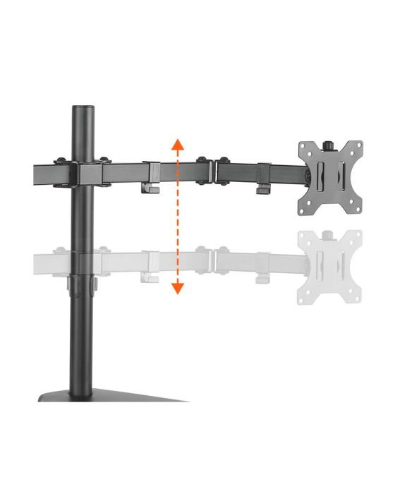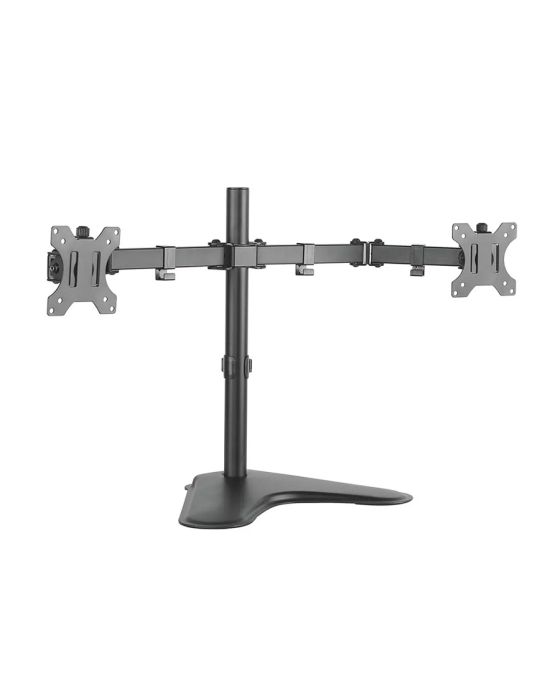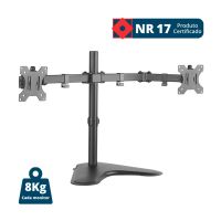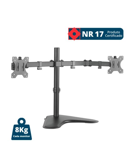 CaraterísticasIndicado para monitores com peso, sem a base original, de até 8 kg (em cada braço) e compatíveis com padrão de fixação VESA (horizontal x vertical) 75x75 ou 100x100 mm, normalmente encontrado em monitores de 17 a 32 polegadas. O suporte de mesa para dois monitores T1224N, pode sustentar até 02 monitores simultaneamente, pois possui duas articulações independentes para fixação na traseira dos monitores, as quais permitem girar lateralmente ou inclinar as telas, para uma melhor visualização e ergonomia, além de possuir ajuste de altura na coluna vertical do suporte. Prático e versátil, também permite girar as telas nas posições retrato ou paisagem.- Local de instalação: Mesa- Quantidade de monitores: 02 (dois)- Tipo de fixação: Base reforçada- Giro horizontal: 360°- Ajuste de inclinação do monitor: +45°/-45°- Ajuste de nível horizontal do Monitor: Até 90° para esquerda ou Direita (Paisagem / Retrato) Para cada monitor- Regulagem de altura vertical: até 450 mm- Dimensão total dos Braços: 898 mm- Cor: Preto- Material: Aço carbono- Acabamento: Tratamento anticorrosão e pintura epóxi eletrostática Compatibilidade:- Polegadas compatíveis: 17 a 32- Furação VESA (HxV): 75x75 e 100x100 mm- Carga máxima: 8 Kg (em cada Braço)- Dimensões da embalagem (LxAxP): 320 x 160 x 420 mm- Peso: 6,33 kg- Conteúdo da Embalagem: 1 Suporte de Mesa Articulado para 2 Monitores, 1 Manual de instruções / Termo de Garantia, Acessórios para instalação do suporte na mesa, Acessórios para instalação do monitor no suporte- Garantia: 1 ano contra defeitos de fabricação do (47) 3467-4299Importante:- Leia atentamente o manual antes de instalar.- Verifique se a superfície de instalação apresenta resistência suficiente para uma instalação segura.- Fique atento a carga máxima indicada para o suporte. Aconselhamos que a instalação seja realizada por um profissional da área.- A ELG pedestais não se responsabiliza por problemas ocasionados pela incorreta instalação ou peças acopladas aos suportes.- A garantia limita-se apenas ao suporte, desde que todas as recomendações acima sejam respeitadas, principalmente o peso de seu monitor/TV.* As especificações podem ser alteradas sem aviso prévio ** Imagem meramente ilustrativa.
