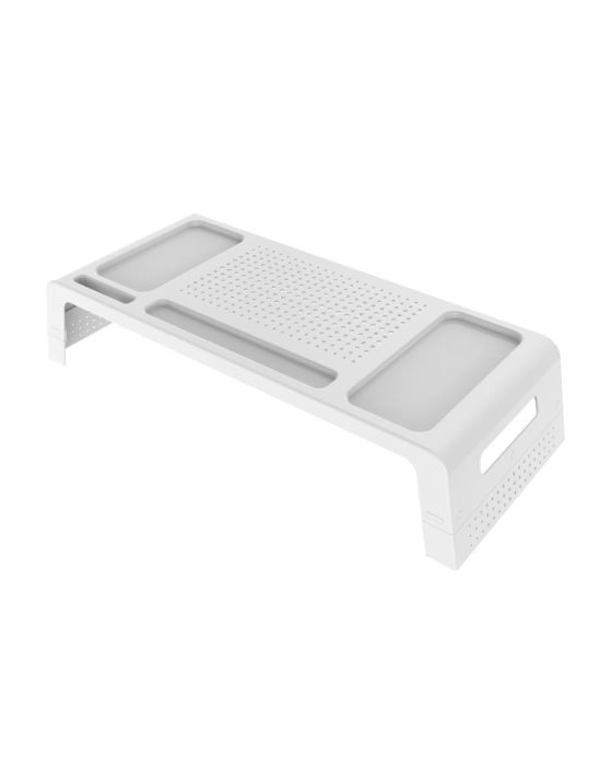 Caracteristicas:Design estrategicamente pensado tanto para apoiar os equipamentos, quanto para organização de outros acessórios da sua mesa.- Tamanho adequado para deixar o teclado na parte de baixo do suporte- Local para smartphone de pé- Possui 3 ajustes de altura (7,9cm/ 12,4cm / 15,5cm)- Ideal para organizar e apoiar monitor ou notebook- Compartimento para armazenar: lápis, canetas, réguas, grampeador, blocos de anotações etc.- Produzido em poliestireno- Medidas: 15,5x23,7x59cm * As especificações podem ser alteradas sem aviso prévio ** Imagem meramente ilustrativa