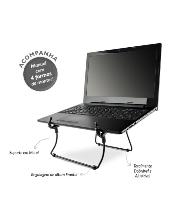 Caracteristicas:“Trabalhar horas olhando para o notebook requerem cuidados especiais com sua saúde e postura.”O Suporte para Notebook Reliza faz a correção da linha de visão do usuário à tela do notebook, aliviando o esforço exercido sobre a região cervical e ajuda à evitar fadiga nas regiões da lombar, nuca e pescoço. Produto Ergonômico em conformidade com a NR 17 do Ministério do Trabalho (Norma Regulamentadora - Ergonomia). Previne doenças ocupacionais, como as Dores Osteomusculares Relacionadas ao Trabalho (D.O.R.T).- Estrutura de hastes construída em Aço tubular de 6mm- Juntas das hastes (perfis “T”) fabricadas em plástico de engenharia de alta resistência- Sapatas de apoio feitas em borracha antiderrapante- 4 formas diferentes de montagem- Regulagem de inclinação- Elevação frontal - Suporte Dobrável- Base antiderrapante - Cor: Preto• Dimensões do Suporte montado na forma “Frontal elevada” (padrão):- Altura: 16 cm- Largura: 23 cm- Profundidade: 26,5 cm • Dimensões do Suporte em modo compactado (para transporte):- Altura: 3 cm- Largura: 28,5 cm- Profundidade: 16,5 cm • Peso:- Com caixa: 0,430 Kg- Sem caixa: 0,340 KgAtenção! É necessário o uso de mouse e teclado externos ao utilizar o Suporte para Notebook para que seja aplicada a postura correta, evitando assim a extensão excessiva dos punhos.*Não acompanha teclado, nem notebook* As especificações podem ser alteradas sem aviso prévio ** Imagem meramente ilustrativa