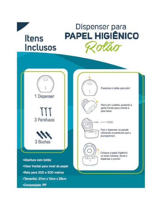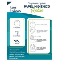 Caracteristicas:Dispenser Papel Higiênico Rolão- Fácil instalação- Alta resistência- Papel: Rolão de 30 a 500 metros- Acompanha buchas e parafusos- Cor: Branco- Marca: Contabilista * As especificações podem ser alteradas sem aviso prévio ** Imagem meramente ilustrativa