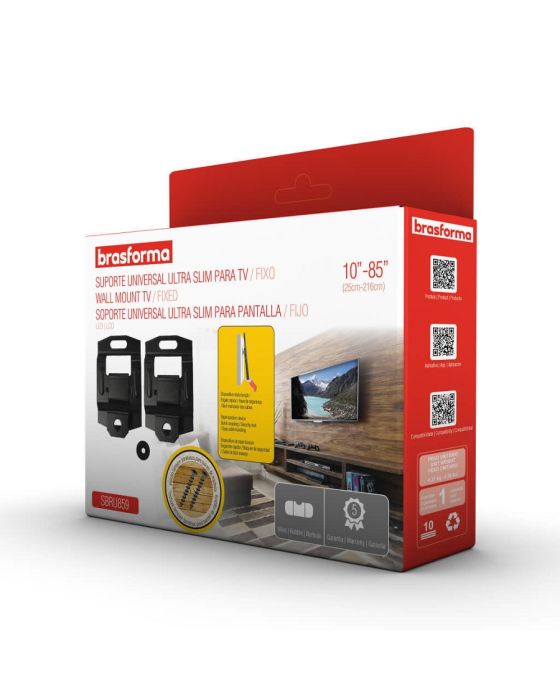 CaraterísticasO Suporte Fixo Universal para TV da Brasforma proporciona visão frontal, é fácil de instalar, permite engate rápido e é indicado para TVs LED, LCD, Plasma, 3D e Smart TV de 10 a 85 polegadas. Possui trava de segurança, dispositivo basculante para fácil manuseio dos cabos. Acompanha parafusos e buchas para alvenaria, parafusos para painel de madeiras e nível de bolha.- Tipo: FIXO- Polegadas: 10 - 85- Distância mínima da parede: 3 cm- Distância máxima da parede: 3 cm- Local de Instalação: Parede- Furação: VESA Universal- Pontos de Fixação: 2 pontos- Parafusos: M4x20mm, M6x20mm e M8x20mm- Capacidade de Carga: 100kg- Material: Aço carbono, tratamento anticorrosivo e pintura eletrostática- Fácil instalação- Engate rápido- Nível Bolha- Trava de segurança- Cor: Preto- Peso: 0,27kg- Garantia: 5 anos de garantia contra defeitos de fabricação através do suporte Brasforma (11) 2246-0222 ou [email protected]- Conteúdo da Embalagem: 1 Suporte Fixo Universal para TV – Brasforma SBRU859, Kit de Parafusos e Buchas, Nível Bolha, Parafuso para painel de madeira e 1 Manual de instruções / Gabarito para instalaçãoObservações:- Verifique se a superfície de instalação apresenta resistência suficiente para uma instalação segura.- Fique atento a carga máxima indicada para o suporte.- Aconselhamos que a instalação seja realizada por um profissional da área.- Verifique se a furação de sua TV é compatível com o suporte. * As especificações podem ser alteradas sem aviso prévio ** Imagem meramente ilustrativa.