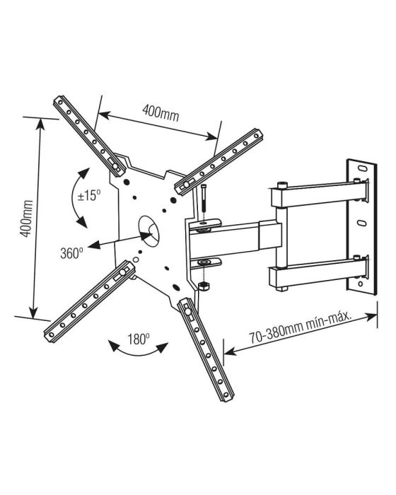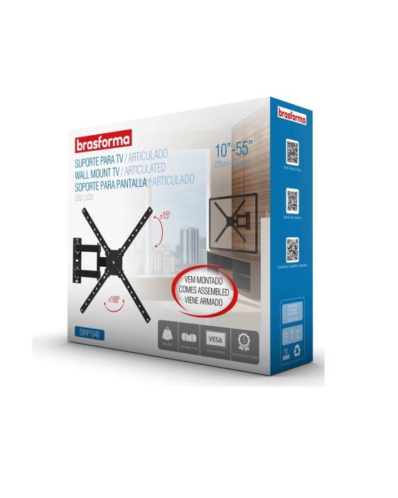 CaraterísticasSuporte Articulado Brasforma para TVs LCD, LED, Plasma, 3D e Smart TV de 10 até 55 polegadas (com VESA máximo de 400x400mm). Permite articulação, inclinação e rotação de 360º graus da base (5 movimentos). Permite Ajustar a TV para assistir de vários ângulos. Ideal para salas, escritórios, quartos, hospitais, restaurantes, entre outros locais. Permite visão modo retrato e paisagem e já vem montado!- Local de Instalação:- Inclinação: 15°- Articulação: 180°- ARTICULÁVEL E INCLINÁVEL - Para visão frontal, lateral e superior- Distância mínima da parede: 7cm- Distância máxima da parede: 38cm- Pontos de Fixação: 4 pontos- Suporta TV´s de 10 - 55- Capacidade de Carga: 30kg- Furação VESA: 50x50, 75x75, 100x100, 200x100, 200x200, 300x200, 300x300, 400x100, 400x400mm- Cor: Preto- Peso: 1,84kg- Dimensões do Produto (LxAxP): 400 x 400 x 80mm- Material: Aço carbono, tratamento anticorrosivo e pintura eletrostática- Garantia: 5 anos de garantia contra defeitos de fabricação através do suporte Brasforma (11) 2246-0222 ou [email protected]- Conteúdo da Embalagem: 1 Suporte para TV, Hastes extensoras para VESA 400x400mm, Kit de Parafusos, 1 Nível de bolha e 1 Manual de instruções- Verifique se a superfície de instalação apresenta resistência suficiente para uma instalação segura.- Fique atento a carga máxima indicada para o suporte.- Aconselhamos que a instalação seja realizada por um profissional da área.- Verifique se a furação de sua TV é compatível com o suporte.** As especificações podem ser alteradas sem aviso prévio *** Imagem meramente ilustrativa.