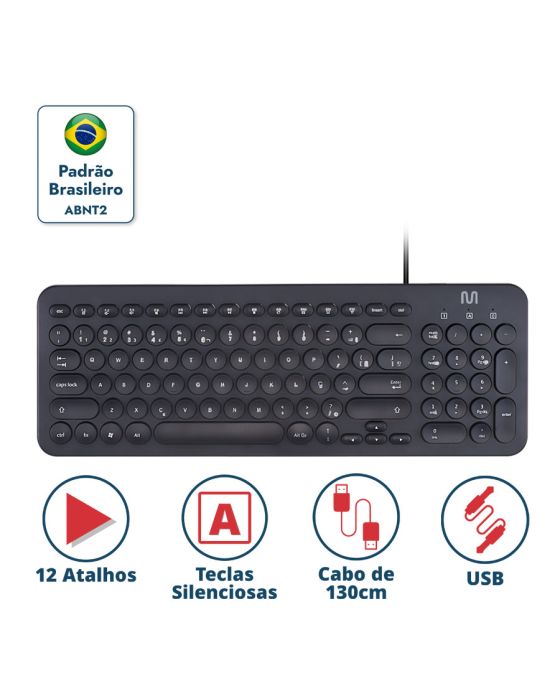 CaracteristicasTeclas Arredondadas - Maior conforto e precisão.Praticidade E Conforto - Elimine os fios da sua mesa e digite com mais conforto.Mais elegante e confortável12 Teclas De Atalho - Acesso rápido ao e-mail multimídia e outros.- Conexão: USB- Compatibilidade: Windows- Teclado númerico possui vírgula- Dimensões: 465 x 225 x 185mm- Peso: 865g- Garantia: 3 Anos contra defeitos de fabricação- Conteúdo da Embalagem: 1 Teclado * As especificações podem ser alteradas sem aviso prévio ** Imagem meramente ilustrativa