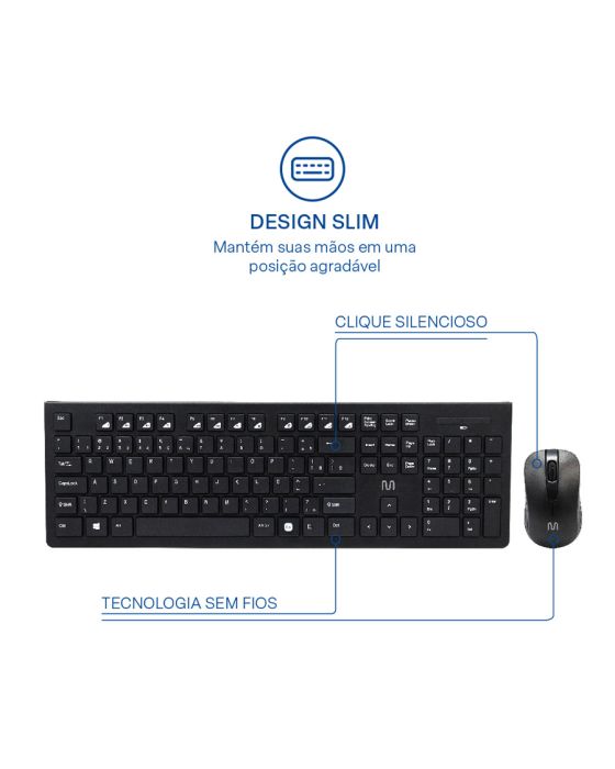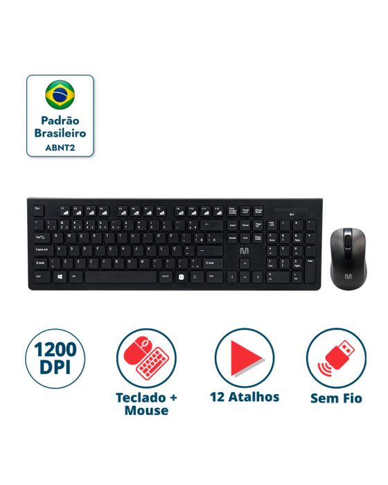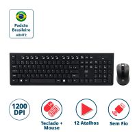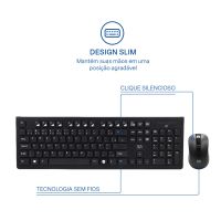 Caracteristicas- Conexão automática, conecte a entrada USB e começe a usar- Possui design elegante além de manter suas mãos em uma posição agradável.- Compatibilidade: Windows ou Mac OSTeclado:- Alimentação 1 Pilha AAA (Não inclusa)- Dimensões (mm) 435 x 135 x 23- Teclas macias e silenciosas- Teclas de perfil baixo: Proporcionam uma digitação silenciosa e confortável Mouse:- Alimentação 1 Pilha AAA (Não inclusa)- Dimensões (mm) 57 x 9 x 26 cm- Tecnologia 2.4Ghz: Permite o uso em até 8 metros de distância- Garantia: 3 Anos contra defeitos de fabricação- Conteúdo da Embalagem: 1 Mouse, 1 Teclado, 1 Guia rápido e (Mini receptor está no compartimento de pilhas do Mouse) * As especificações podem ser alteradas sem aviso prévio ** Imagem meramente ilustrativa