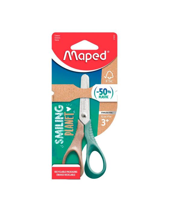 Características:Com seus anéis feitos de 50% de fibras de madeira certificadas pelo FSC, as tesouras Smiling Planet Vivo fazem jus ao seu nome! Esta composição responsável permite-lhes incorporar 50% menos plástico do que as tesouras normais. Tesoura para crianças a partir dos 3 anos.Tesouras de aprendizado para um manuseio e controle perfeitos. Para os alunos: alças ergonômicas 3D para uma melhor aderência para mãos pequenas. Segurança: pontas arredondadas das lâminas. Lâminas de aço inoxidável.Detalhes:- Marca: Maped;- Modelo: Smiling Planet Vivo;- Referência: 472020FM;- Linha: Tesoura;- Cor: Verde/Bege;- Contém: 1 blister com 1 unidade do produto;- Segurança: Segurança: pontas arredondadas das lâminas;- Lâminas: Lâminas de aço inoxidável;- Alças ergonômicas 3D;- A partir dos 3 anos;- Produto certificado: FSC.Composição:- Fabricado em 50% fibras de madeira certificadas pelo FSC, 50% plástico e lâmina de aço inoxidável.* As especificações podem ser alteradas sem aviso prévio ** Imagem meramente ilustrativa