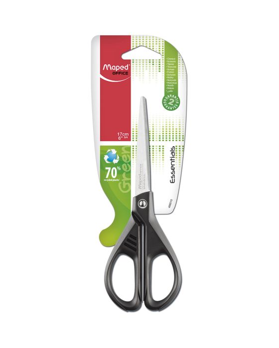 Caracteristicas:-Tesoura Essentials Green – 17 cm-Tesoura Multiuso com anéis ergonômicos, feitos em plástico 70% reciclado.-Lâminas e rebite em aço inoxidável.-2 anos de garantia contra defeitos de fabricação. * As especificações podem ser alteradas sem aviso prévio ** Imagem meramente ilustrativa.