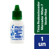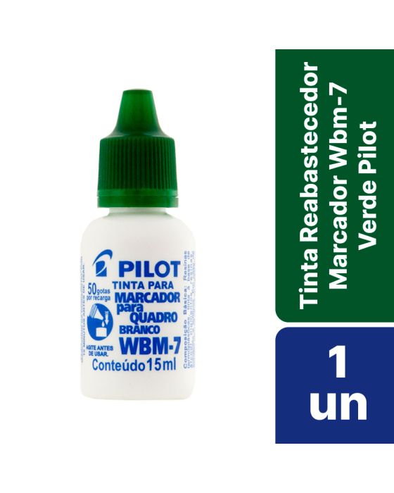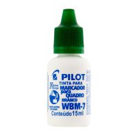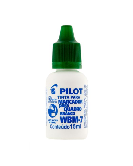Características:A Tinta para Marcador de Quadro Branco WBM-7 é uma fórmula desenvolvida sob medida para o Marcador de Quadro Branco WBM-7 da PILOT. Com propriedades cuidadosamente selecionadas, essa tinta é projetada para manter e prolongar as qualidades excepcionais do seu marcador, garantindo uma escrita suave e marcante.Ao recarregar o seu marcador WBM-7 com esta tinta, você garante qualidade da escrita e a durabilidade e a garantia do seu produto. Poucas gotas são necessárias para a recarga, de forma que 50 gotinhas realizam uma recarga completa do WMB-7.Detalhes:- Marca: Pilot;- Modelo: WBM-7;- Referência: 1060001;- Linha: Tintas para Marcador;- Volume: 15ml;- Cor: Verde;- Contém: 1 unidade do produto;- Tinta permanente;- Desenvolvida para manter as qualidades do marcador usado e prolongar sua vida útil.Observações:- Ao utilizar outra tinta a não ser esta, toda a garantia do marcador estará perdida;- Usar qualquer outro modelo de tinta (mesmo que seja da PILOT) pode causar entupimento no marcador e prejudicar o seu funcionamento.Armazenagem:- Evite expor o produto em temperaturas acima de 45?°C e exposição direta aos raios solares;- Armazene o produto em local seco e arejado para garantir a integridade da tinta;- Em caso de contato com os olhos ou ingestão, consulte um médico imediatamente;- Em contato com a pele, lave abundantemente com água e sabão;- Mantenha fora do alcance de crianças.Composição:- Resinas Termoplásticas, Tinta base de álcool, pigmentos, resinas, solventes e aditivos (preparado).ATENÇÃO! MANTENHA FORA DO ALCANCE DAS CRIANÇAS E DOS ANIMAIS DOMÉSTICOS.* As especificações podem ser alteradas sem aviso prévio ** Imagem meramente ilustrativa.