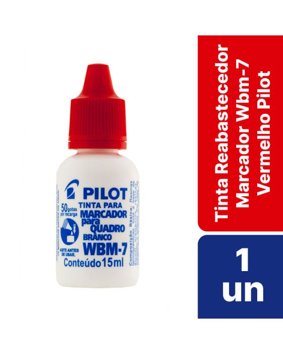 Características:A Tinta para Marcador de Quadro Branco WBM-7 é uma fórmula desenvolvida sob medida para o Marcador de Quadro Branco WBM-7 da PILOT. Com propriedades cuidadosamente selecionadas, essa tinta é projetada para manter e prolongar as qualidades excepcionais do seu marcador, garantindo uma escrita suave e marcante.Ao recarregar o seu marcador WBM-7 com esta tinta, você garante qualidade da escrita e a durabilidade e a garantia do seu produto. Poucas gotas são necessárias para a recarga, de forma que 50 gotinhas realizam uma recarga completa do WMB-7.Detalhes:- Marca: Pilot;- Modelo: WBM-7;- Referência: 1060001;- Linha: Tintas para Marcador;- Volume: 15ml;- Cor: Vermelho;- Contém: 1 unidade do produto;- Tinta permanente;- Desenvolvida para manter as qualidades do marcador usado e prolongar sua vida útil.Observações:- Ao utilizar outra tinta a não ser esta, toda a garantia do marcador estará perdida;- Usar qualquer outro modelo de tinta (mesmo que seja da PILOT) pode causar entupimento no marcador e prejudicar o seu funcionamento.Armazenagem:- Evite expor o produto em temperaturas acima de 45?°C e exposição direta aos raios solares;- Armazene o produto em local seco e arejado para garantir a integridade da tinta;- Em caso de contato com os olhos ou ingestão, consulte um médico imediatamente;- Em contato com a pele, lave abundantemente com água e sabão;- Mantenha fora do alcance de crianças.Composição:- Resinas Termoplásticas, Tinta base de álcool, pigmentos, resinas, solventes e aditivos (preparado).ATENÇÃO! MANTENHA FORA DO ALCANCE DAS CRIANÇAS E DOS ANIMAIS DOMÉSTICOS.* As especificações podem ser alteradas sem aviso prévio ** Imagem meramente ilustrativa.