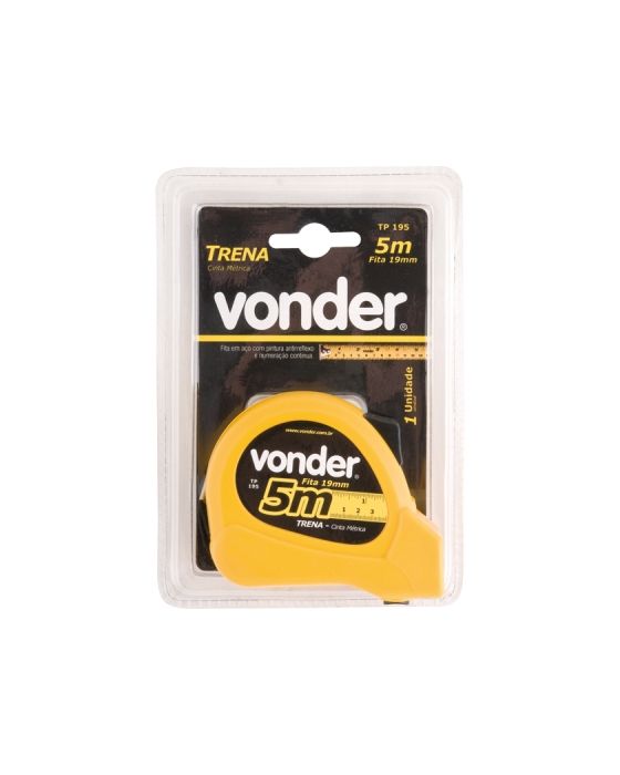 Características: - Trena com Estojo anatômico em ABS com borracha termoplástica, - Fita em aço com pintura fosca antirreflexo, - numeração contínua, - Botão de travamento da fita, - Clipe metálico para cinto, - Alça de nylon para transporte, - Gancho autoajustável na ponta da fita, permitindo medições internas e externas mais precisas Graduação: mm/pol. - Comprimento: 5 metros - Largura da fita: 12,5 mm - Alça para transporte. - Peso: 190 gramas - marca: Vonder* As especificações podem ser alteradas sem aviso prévio ** Imagem meramente ilustrativa.