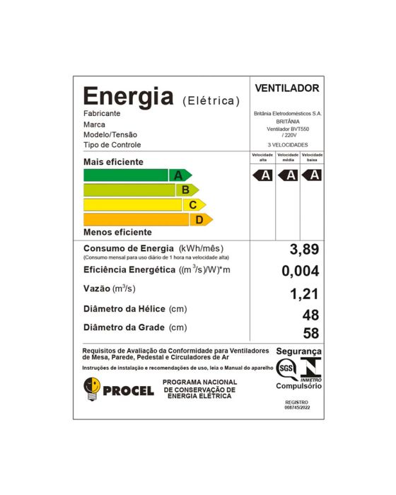 Características:Com 175W de potência, o Ventilador de Coluna Britânia BVT550 entrega maior poder de ventilação para dizer adeus aos dias quentes! Desenvolvido com tecnologia Maxx Force, inclui Hélice de 6 pás com 48cm com altíssimo desempenho.Seu design com grade de 58cm garante mais praticidade! É fácil de montar, desmontar e limpar, além de ser equipado com 3 opções de velocidades, suave, moderada e intensa que se adéquam à sua necessidade. A grande flexibilidade do sistema de articulação permite ajustar as 3 opções de oscilação vertical e oscilação horizontal automática.Superseguro, o motor foi desenvolvido com sistema de que interrompe o funcionamento do produto quando há superaquecimento e sistema de travamento de grades, além disso, no quesito silencio, ele desempenha com excelente força de vento e com mínimo de ruído.Os dias de verão não serão mais os mesmos, o Ventilador de Coluna Britânia Turbo Silencioso 175W BVT550 irá agradar e refrescar esses momentos! Detalhes:- Marca: Britânia;- Modelo: Maxx Force;- Referência: BVT550;- Linha: Ventiladores;- Cor: Preto;- Tensão: 220V;- Potência: 175W;- Tipo de instalação: Coluna;- Contém: 1 unidade do produto;- Número de velocidades: 3 velocidades (suave, moderada e intenso);- Quantidade de pás: 6 pás;- Hélice com diâmetro de 48cm;- Grade com diâmetro de 58cm;- Grade Plástica frontal removível;- Inclinação vertical;- Oscilação horizontal automática;- Baixo nível de ruído;- Super Silencioso;- Grade turbo;- Motor com fusível térmico.Energia:- Tensão: 220V;- Potência: 175W;- Vazão: 1,21 m3/s;- Eficiência Energética (m3/s)W)*m: 0,004;- Consumo de energia (kWh/mês): 3,89;- Classificação energética: Velocidade Alta: A / Velocidade Média: A / Velocidade Baixa: A.Medidas:- Dimensões do produto: 45,5 x 57 x 167cm (CxLxA);- Dimensões da embalagem: 58 x 17 x 80,5cm (CxLxA);- Peso do produto: 7,653kg;- Peso da embalagem: 8,685kg.Conteúdo da embalagem: 1 ventilador Britânia Maxx Force BVT550 e 1 manual de instruções.Garantia do fornecedor: 1 ano contra defeitos de fabricação.