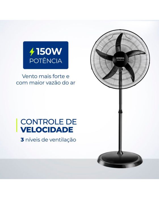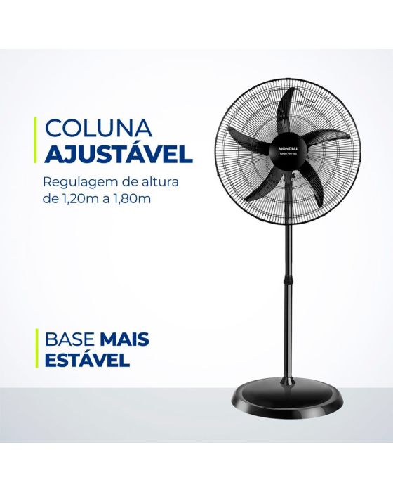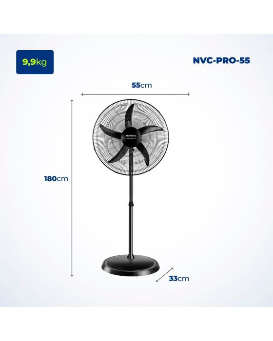 Características:O Ventilador de Coluna Turbo Pro NVC-PRO-55 possui 55 cm de diâmetro e um design aerodinâmico de alta performance, que garante um ambiente sempre fresquinho, mesmo nos dias de calor intenso. O motor Turbo Pro de 150W, aliado a hélice de 5 pás, gera mais intensidade do vento e maior vazão do ar. Com coluna ajustável entre 1,20 e 1,80 metros, o ventilador permite ajuste da altura.Detalhes:- Marca: Mondial;- Modelo: Turbo Pro;- Referência: NVC-PRO-55;- Linha: Ventiladores;- Cor: Preto;- Tensão: 127V;- Tipo de instalação: Coluna (não precisa de instalaçao);- Contém: 1 unidade do produto;- Ventilador de 55cm + Hélice com 5 Pás;- Otimização do Espaço + Suporte de Aço Reforçado;- Potência: 150W;- Coluna Ajustável;- Grades de Aço Desmontável;- Controle de Velocidade;- Maior distribuição de ar;- Inclinação Vertical Regulável: Para um direcionamento ideal do fluxo do ar.Ventilador:- Ventilador de 55cm + Hélice com 5 Pás: O design aerodinâmico e de alta performance do NVC-PRO-55 proporciona maior intensidade do vento e melhor distribuição de ar. O resultado é um ambiente mais fresco e arejado;- Potência: 150W: Garante vento mais forte e com maior vazão do ar;- Coluna Ajustável: Possui regulagem de 1,20 a 1,80 metros, permitindo o ajuste ideal da altura do vento;- Grades de Aço Desmontável: A grade frontal de aço desmontável oferece mais segurança, resistência e facilidade na limpeza das hélices, o que simplifica a lavagem e a remoção de poeira, e garante melhor qualidade do ar;- Controle de Velocidade: As 3 opções de velocidade permitem adequar o vento à sua necessidade: Máxima Turbo, Média Conforto e Mínima Brisa;- Maior Distribuição de Ar: O Sistema Oscilante Contínuo amplia o raio de alcance do vento no ambiente, permitindo uma distribuição de ar mais eficiente nos cômodos da casa;- Inclinação Vertical Regulável: Para um direcionamento ideal do fluxo do ar.Energia:- Tensão: 127V;- Potência: 150W.Medidas:- Dimensões do produto: 150 x 45 x 41cm (AxLxP);- Peso: 3kg.Conteúdo da embalagem: 1 ventilador e 1 manual de instruções.Garantia do fornecedor: 1 ano contra defeitos de fabricação.* As especificações podem ser alteradas sem aviso prévio ** Imagem meramente ilustrativa