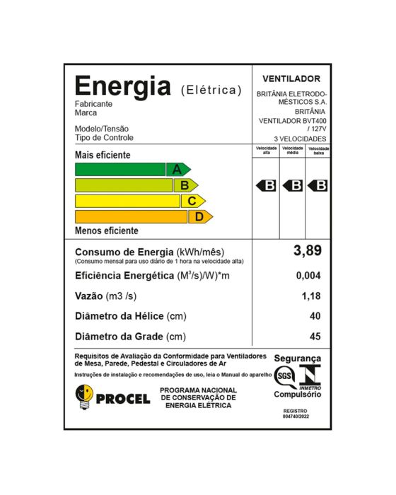 Características:O Ventilador Britânia 2 em 1 Maxx Force Turbo 150W BVT400 é uma ótima opção para refrescar com várias funções para o seu bem-estar! São 3 velocidades que se adequam a sua necessidade, escolha entre as opções suave, moderado e intenso.A potência de 150W, a hélice com novo formato e a tecnologia Maxx Force, hélice de 6 pás com 40 cm, desempenham com maior vazão de ar e capacidade de ventilação.Já a flexibilidade do ventilador Britânia BVT400 proporciona 3 opções de inclinação vertical e botão que aciona a oscilação horizontal automática. 2 em 1, aproveite toda essa versatilidade e utilize o ventilador na mesa, sob bancadas ou como ventilador de parede.Segurança não é um problema, o motor com fusível térmico interrompe o funcionamento do produto se houver superaquecimento, além do sistema de trava das grades.O Ventilador Britânia 2 em 1 Maxx Force Turbo 150W BVT400 faz toda a diferença para amenizar o calor proporcionando conforto e frescor!Detalhes:- Marca: Britânia;- Modelo: Maxx Force Turbo 2 em 1;- Referência: BVT400;- Linha: Ventiladores;- Cor: Preto;- Tensão: 127V;- Potência: 150W;- Tipo de instalação: Mesa ou coluna;- Contém: 1 unidade do produto;- Número de velocidades: 3 velocidades (mínimo, média e máxima);- Quantidade de pás: 6 pás;- Hélice com diâmetro de 40cm;- Grade frontal removível;- Produto versátil, instalação de mesa ou coluna;- Inclinação vertical regulável;- Sistema Oscilante.Diferenciais:- Hélice de 6 pás;- Potência de 150W;- Grade que obedece às normas de segurança (contato com partes móveis);- Oscilação horizontal automática com novo sistema de acionamento (botão integrado à carcaça);- Sistema de articulação para ajuste da inclinação vertical;- Porta-fio;- Novo sistema de travamento entre grade frontal e traseira;- Alça na grade traseira para transportar o aparelho;- Motor com fusível térmico de segurança.Energia:- Tensão: 127V;- Potência: 176W;- Vazão: 1,18 m3/s;- Eficiência Energética (m3/s)W)*m: 0,004;- Consumo de energia (kWh/mês): 3,89;- Classificação energética: Velocidade Alta: B Velocidade Média: B Velocidade Baixa: B.Medidas:- Dimensões do produto: 33 x 45 x 61,5cm (CxLxA);- Dimensões da embalagem: 15,8 x 46,4 x 58,3cm (CxLxA);- Peso do produto: 2,88kg;- Peso da embalagem: 3,358kg.Conteúdo da embalagem: 1 ventilador Britânia Maxx Force Turbo BVT400 e 1 manual de instruções.Garantia do fornecedor: 1 ano contra defeitos de fabricação.* As especificações podem ser alteradas sem aviso prévio ** Imagem meramente ilustrativa.