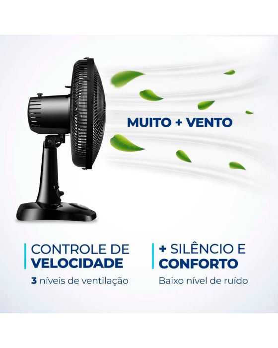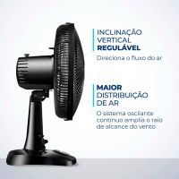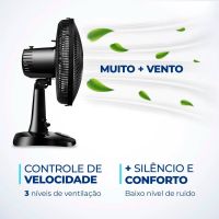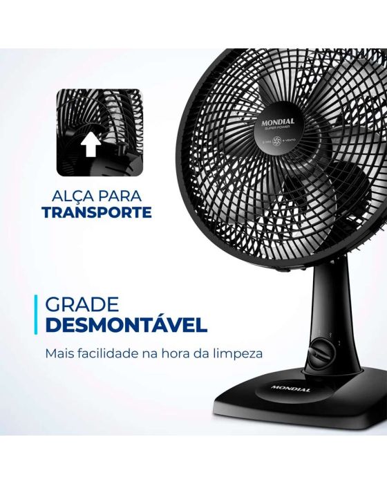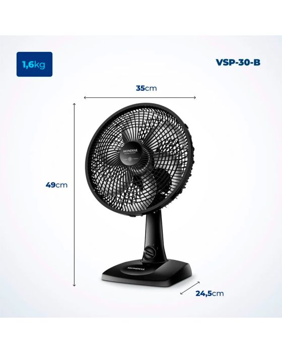 Características:O ventilador Super Power VSP-30-B possui 30 cm de diâmetro e hélice com 6 pás, garantindo um ambiente mais refrescante e agradável. O Sistema Oscilante Contínuo amplia o raio do vento no ambiente e a Inclinação Vertical Regulável é perfeita para o direcionamento do fluxo de ar.Detalhes:- Marca: Mondial;- Modelo: Super Power;- Referência: VSP-30-B;- Linha: Ventiladores;- Cor: Preto;- Tensão: 127V;- Potência: 60W;- Tipo de instalação: Mesa;- Uso: Somente uso interno;- Contém: 1 unidade do produto;- Número de velocidades: 3 velocidades (mínimo, média e máxima);- Quantidade de pás: 6 pás;- Hélice com diâmetro de 30cm;- Grade frontal e traseira removível;- Inclinação vertical regulável;- Mais silêncio e conforto;- Sistema Oscilante.Diferenciais:- Vento Super Power: A linha de Ventiladores Super Power possui 30cm de diâmetro e 6 Pás. O design, aliado à potência, promove maior intensidade do vento e é garantia de um ambiente fresco e agradável.- Mais Silêncio e Conforto: O sistema de ventilação da Mondial apresenta baixo nível de ruído, assegurando o silêncio necessário para momentos de concentração e uma excelente noite de sono.- Maior Distribuição de Ar: O Sistema Oscilante Contínuo amplia o raio de alcance do vento no ambiente, permitindo uma distribuição de ar mais eficiente nos cômodos da casa.- Inclinação Vertical Regulável: Para um direcionamento ideal do fluxo do ar.- Controle de Velocidade: As 3 opções de velocidade permitem adequar o vento à sua necessidade: Máxima Turbo, Média Conforto e Mínima Silencioso.- Facilidade na Limpeza: A grade frontal removível oferece mais facilidade na limpeza das hélices, o que simplifica a lavagem e a remoção de poeira, e garante melhor qualidade do ar.- Alça de Transporte + Porta-Fio: Além do design compacto, a alça traseira permite que o ventilador seja transportado entre os cômodos da casa com facilidade. Com o porta-fio embutido, você armazena o fio elétrico dentro do aparelho após o uso.Energia:- Tensão: 127V;- Potência: 60W.Medidas:- Dimensões do produto: 49 x 35 x 24,5cm (AxLxP);- Peso: 1,670kg.Conteúdo da embalagem: 01 Ventilador de Mesa Super Power 30cm 6 Pás VSP-30-B 127V Mondial e Manual de Instruções.Garantia do fornecedor: 1 ano contra defeitos de fabricação.* As especificações podem ser alteradas sem aviso prévio ** Imagem meramente ilustrativa.