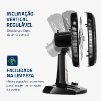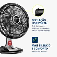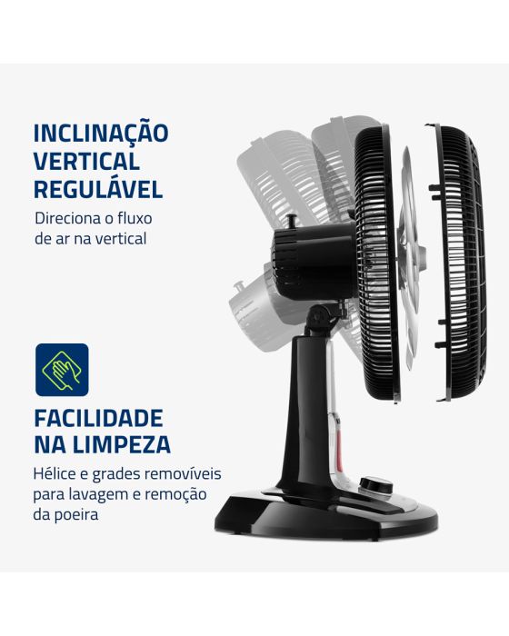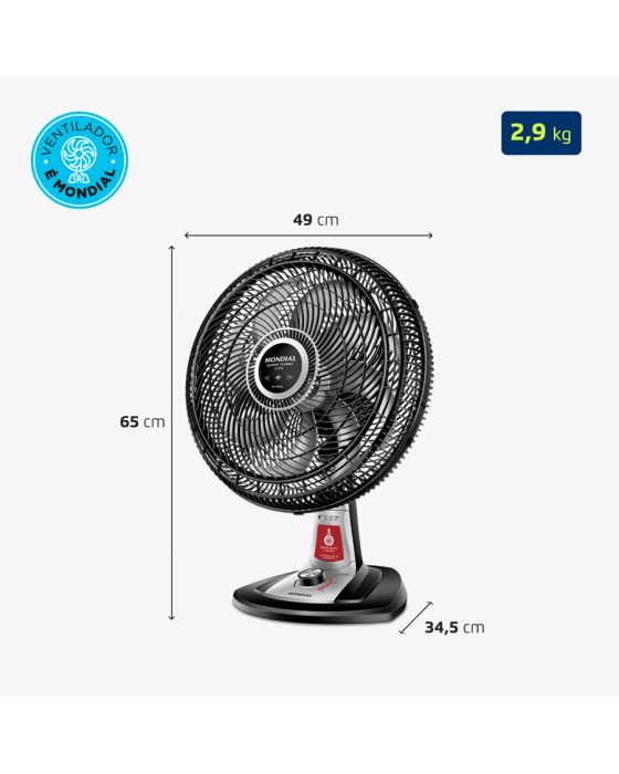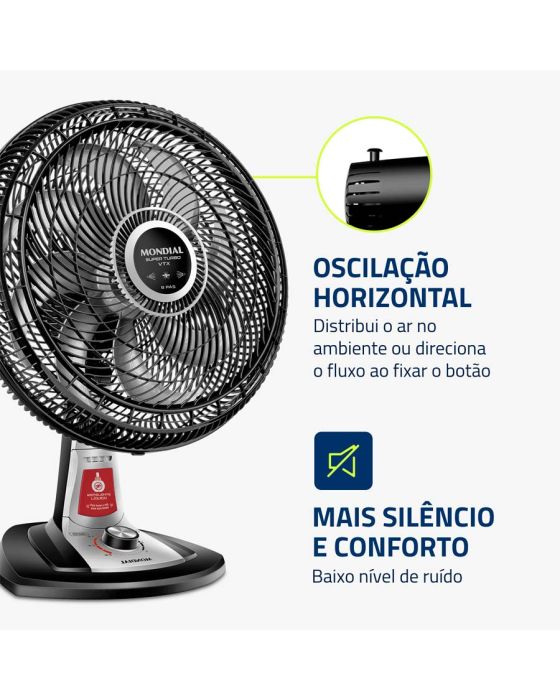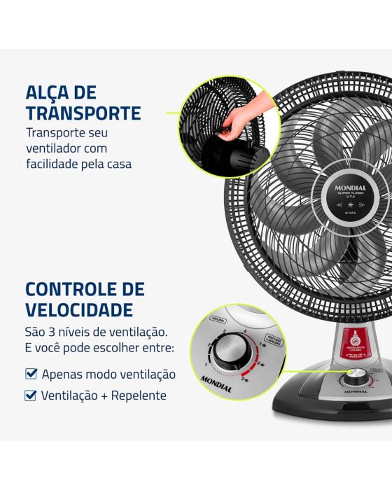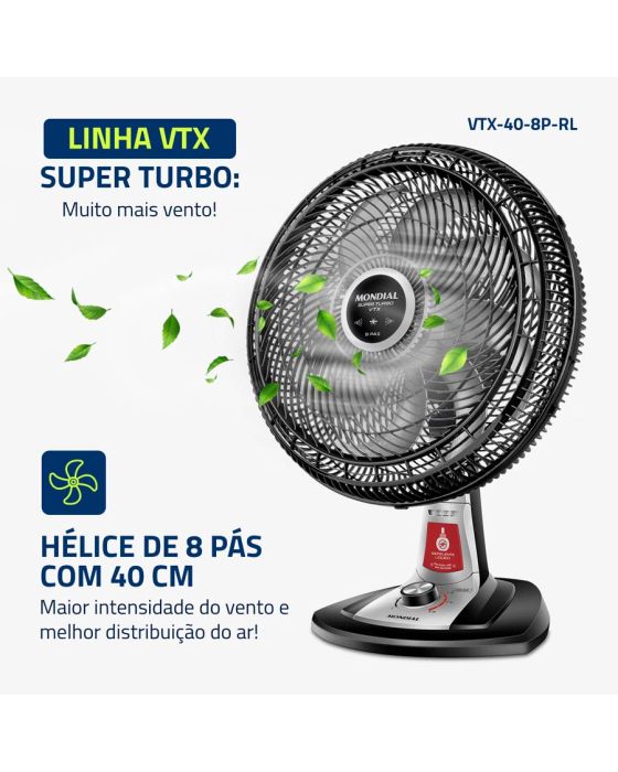 Características:O ventilador de mesa Super Turbo VTX-40-8P-RL possui 40 cm de diâmetro e hélice de 8 pás, o que promove uma circulação de ar mais eficiente e garante mais frescor ao ambiente. O sistema de repelente líquido embutido é garantia de mais proteção contra pernilongos e mosquitos transmissores da Dengue, Zika Vírus e Chikungunya.Detalhes:- Marca: Mondial;- Modelo: Super Turbo;- Referência: VTX-40-8P-RL;- Linha: Ventiladores;- Cor: Preto;- Tensão: 127V;- Tipo de instalação: Mesa;- Uso: Somente uso interno;- Contém: 1 unidade do produto;- Número de velocidades: 3 velocidades (mínimo, média e máxima);- Quantidade de pás: 8 pás;- Hélice com diâmetro de 40cm;- Grade frontal removível;- Inclinação vertical regulável;- Mais silêncio e conforto;- Sistema Oscilante.Diferenciais:- Super Turbo: Muito Mais Vento!: O 1° ventilador de 8 pás do Brasil! O design aerodinâmico e de alta performance do VTX Super Turbo proporciona maior intensidade do vento e melhor distribuição de ar. O resultado é um ambiente mais fresco e arejado!- Mais Silêncio e Conforto: O sistema de ventilação alia a potência para refrescar ao baixo nível de ruído, proporcionando o silêncio necessário para momentos de concentração e uma excelente noite de sono;- Maior Distribuição de Ar: O Sistema Oscilante Contínuo amplia o raio de alcance do vento no ambiente, permitindo uma distribuição de ar mais eficiente nos cômodos da casa;- Inclinação Vertical Regulável : Para um direcionamento ideal do fluxo do ar;- Controle de Velocidade: As 3 opções de velocidade permitem adequar o vento à sua necessidade: Máxima Turbo, Média Conforto e Mínima Silencioso;- Facilidade na Limpeza : A grade frontal removível oferece mais facilidade na limpeza das hélices, o que simplifica a lavagem e a remoção de poeira, e garante melhor qualidade do ar;- Alça de Transporte + Porta-Fio: Além do design compacto, a alça traseira permite que o ventilador seja transportado entre os cômodos da casa com facilidade. Com o porta-fio embutido, você armazena o fio elétrico dentro do aparelho após o uso.Sistema repelente:- Com o sistema de repelente líquido embutido, você e sua família estarão protegidos contra ação de pernilongos, incluindo mosquitos transmissores da Dengue, Zika Vírus, Chikungunya e Febre Amarela.- Compatível com todos os refis do mercado e possui fácil troca de refil.Energia:- Tensão: 127V;- Potência: 140W.Medidas:- Dimensões do produto: 49,5 x 35 x 66cm (CxLxA);- Dimensões da embalagem: 51 x 29,6 x 51,6cm (CxLxA);- Peso: 3,2kg.Conteúdo da embalagem: 1 ventilador de mesa Super Turbo VTX-40-8P-RL Mondial e 1 manual de instruções.Garantia do fornecedor: 1 ano contra defeitos de fabricação.* As especificações podem ser alteradas sem aviso prévio ** Imagem meramente ilustrativa.